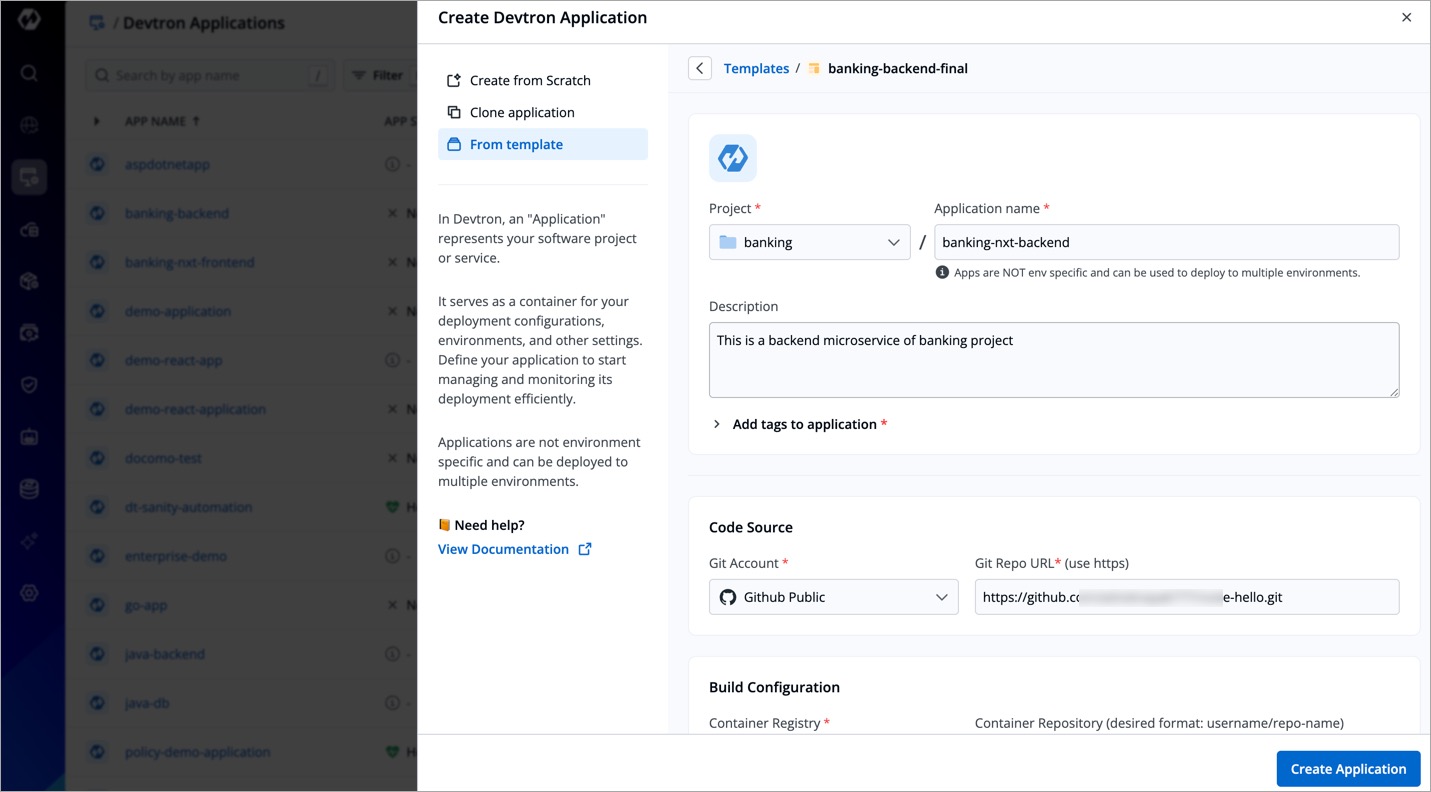 Application templates provide a predefined configuration for creating new applications. You can create an application directly from an application template instead of setting up and repeating the app configuration steps from scratch (such as build configurations, base configurations, CI/CD workflows, and environment details).