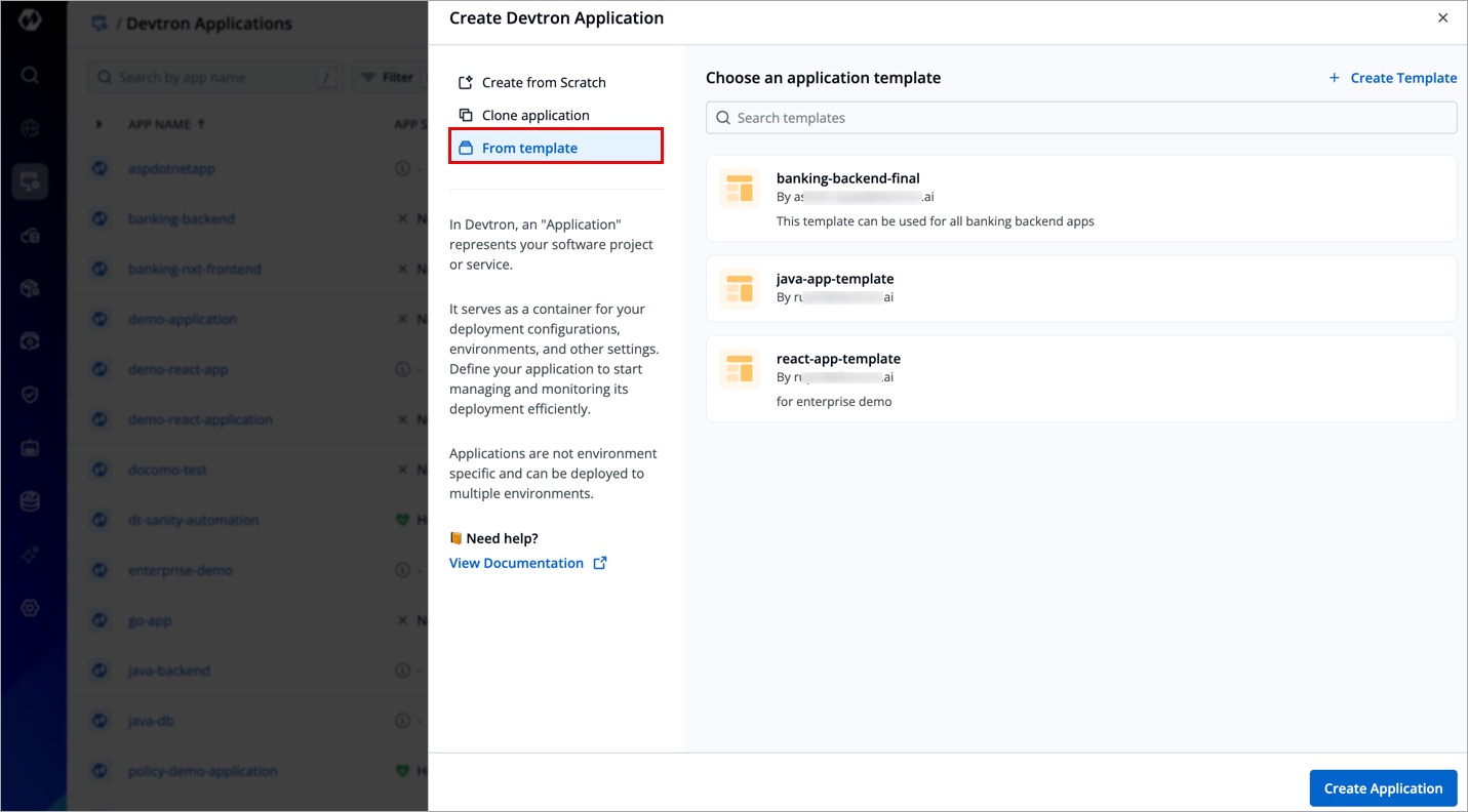 Select From template from the left-side of the modal window; a list of all application templates will appear.