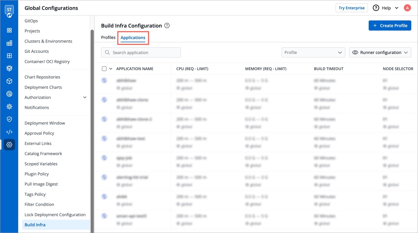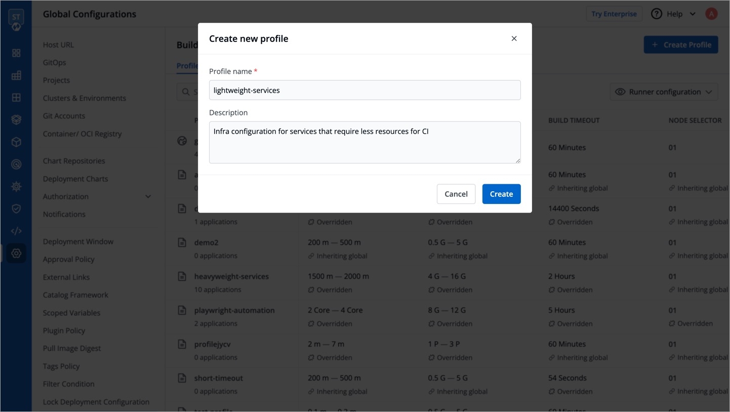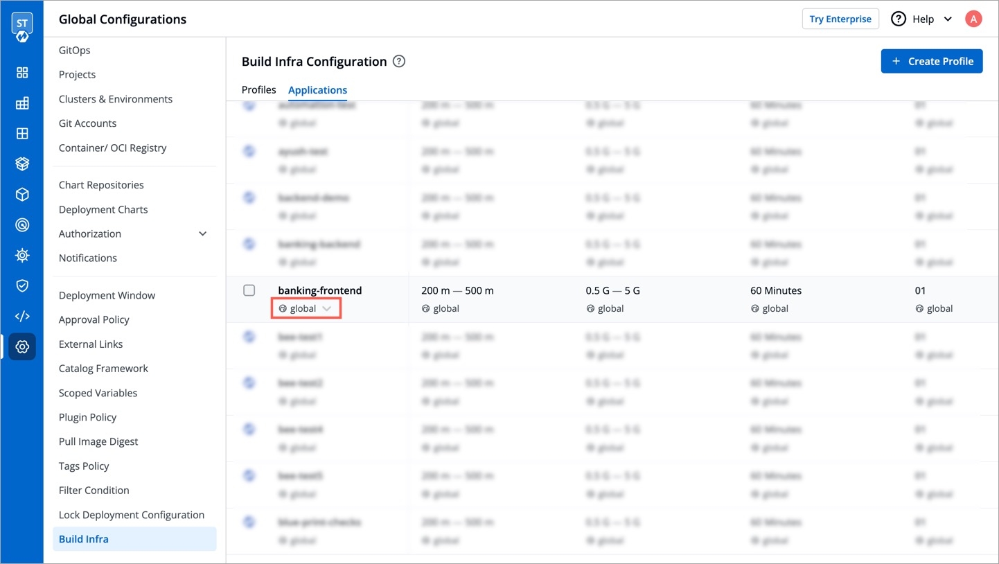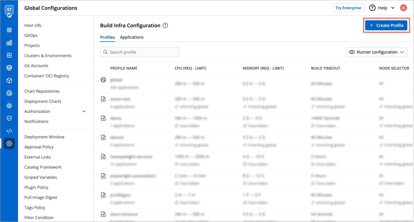 Under Profiles tab, you will see the Global Profile and a list of Custom Profiles (if they exist). Setting up profiles makes it easier for you to manage the build infra configurations, ensuring its reusability in the long term.