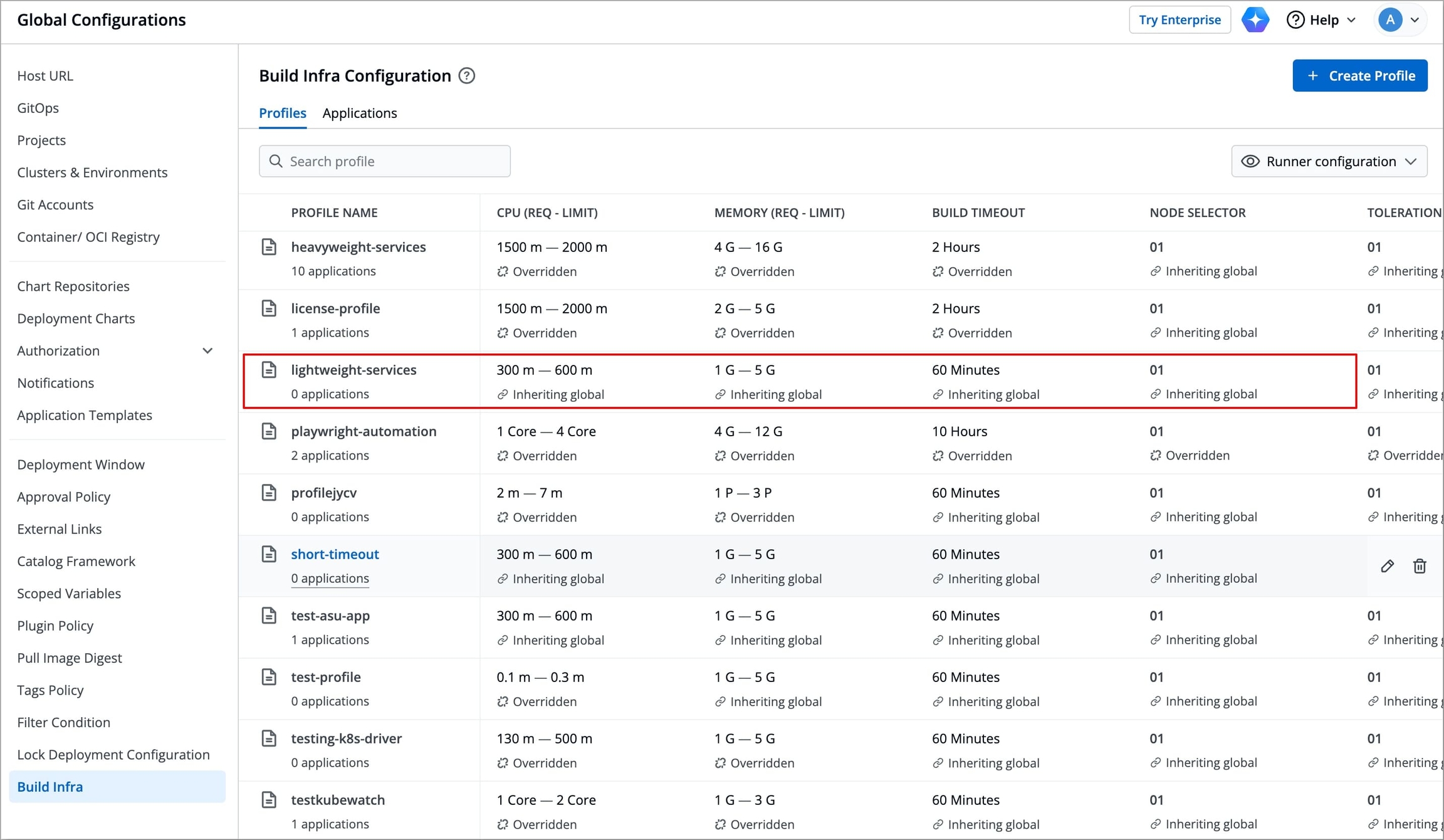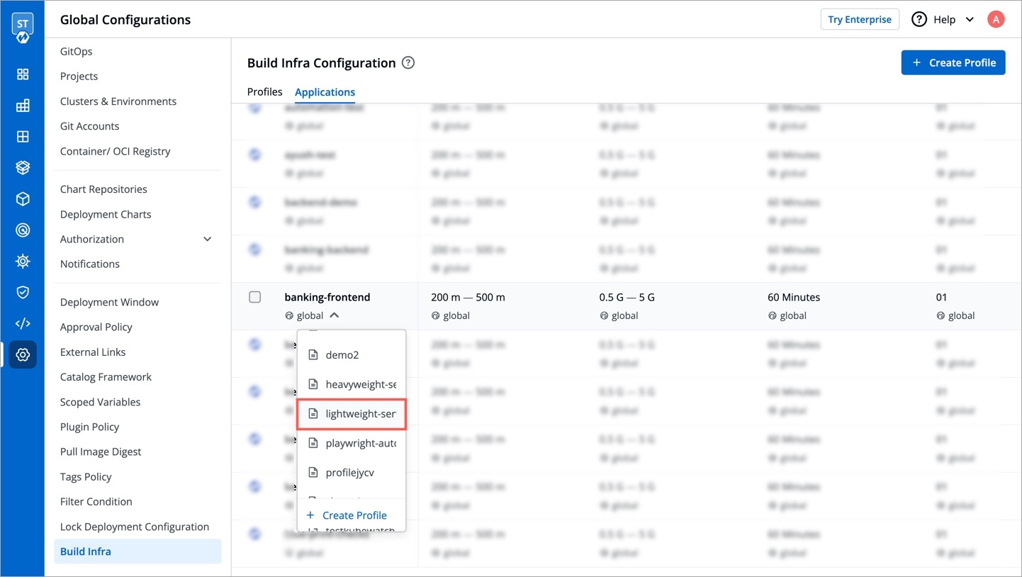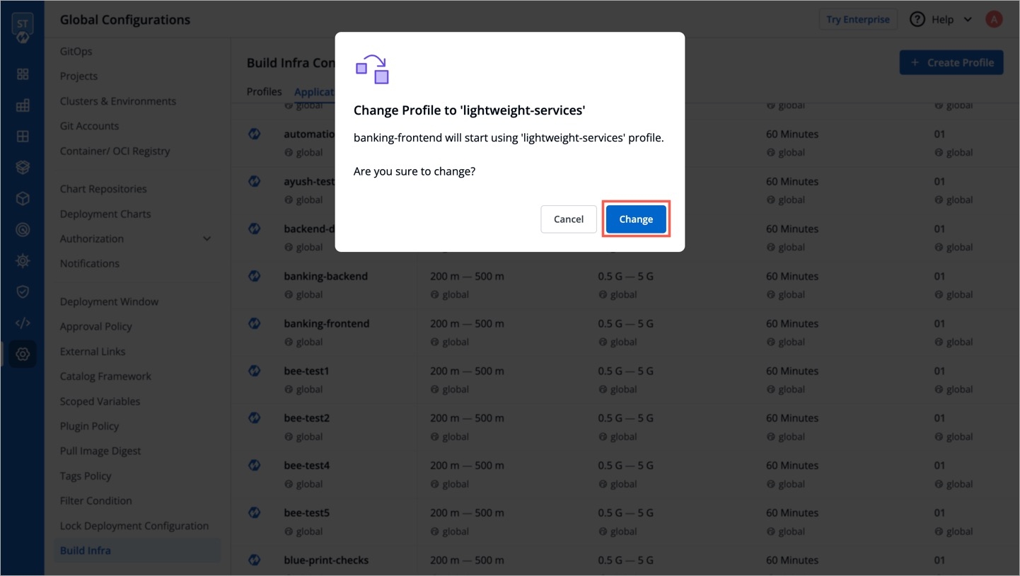 Instead of global profile, you can create custom profiles having different infra configurations. Example: One profile for Python apps, a second profile for large apps, and a third profile for small apps, and many more.
