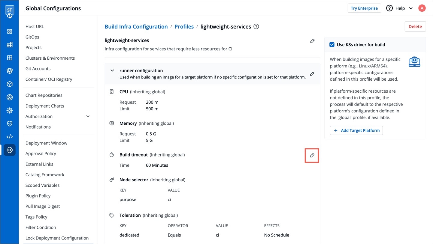 Each platform may have unique requirements for resources like CPU and memory, or they may benefit from different configuration of resources. Thus, Devtron allows defining platform specific configurations within a build infra profile. This ensures each build is executed with the right configurations specific to the target platform.