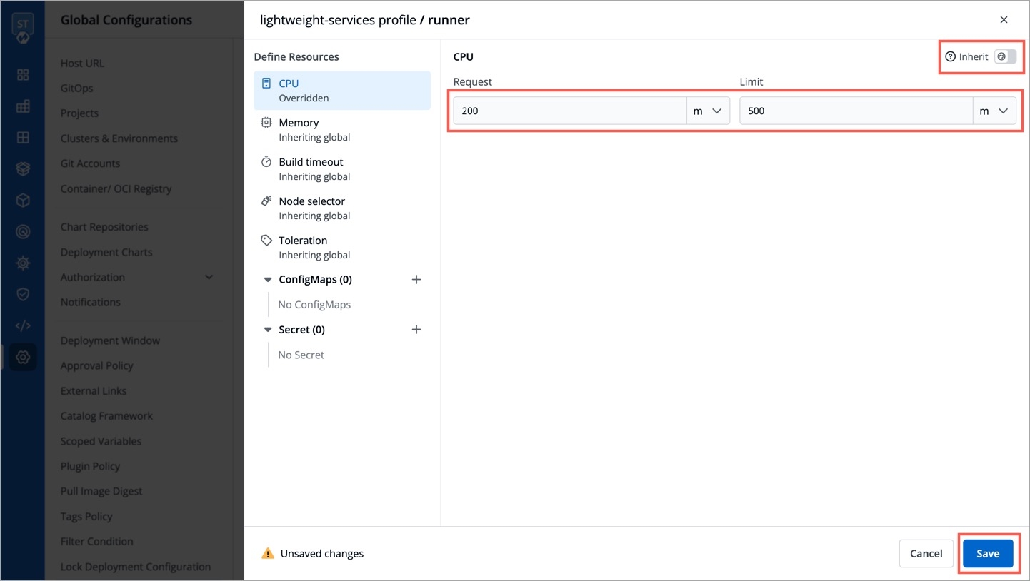 This field is use to specify the minimum guaranteed amount of CPU/Memory resources your application needs for its CI build. In our example, we required 1500m or 1.5 cores CPU along with 6 GB of RAM.
