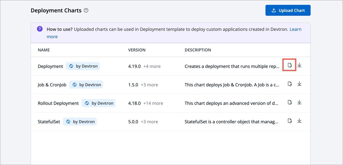 Once you successfully upload a deployment chart, you can start using it as a deployment template for your application. Refer Deployment Template to know more.