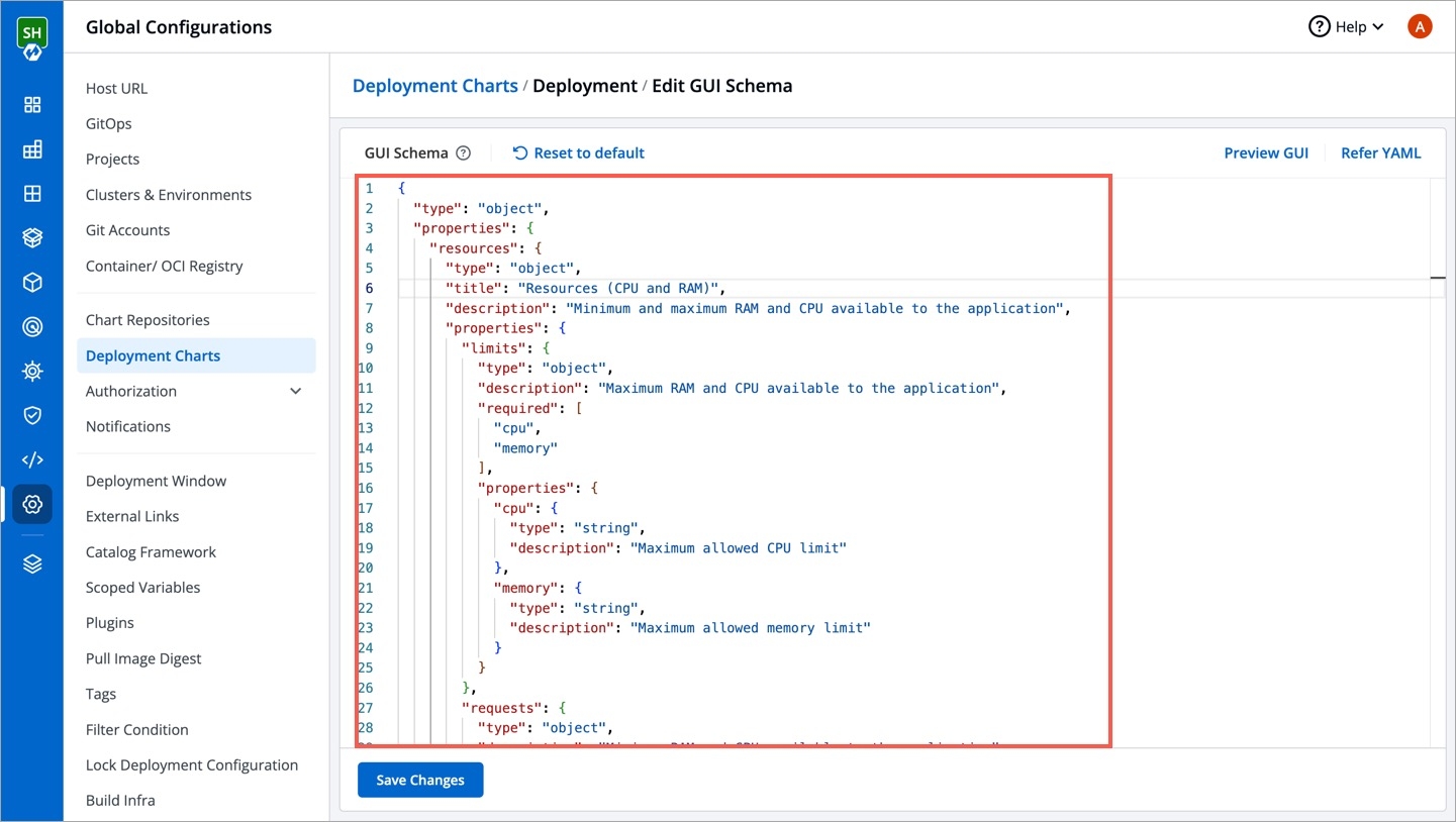 Figure 11: Edit GUI Schema Button A GUI schema is available for you to edit in case of Devtron charts. In case of custom charts, you may have to define a GUI schema yourself. To know how to create such GUI schema, refer RJSF JSON Schema Tool.