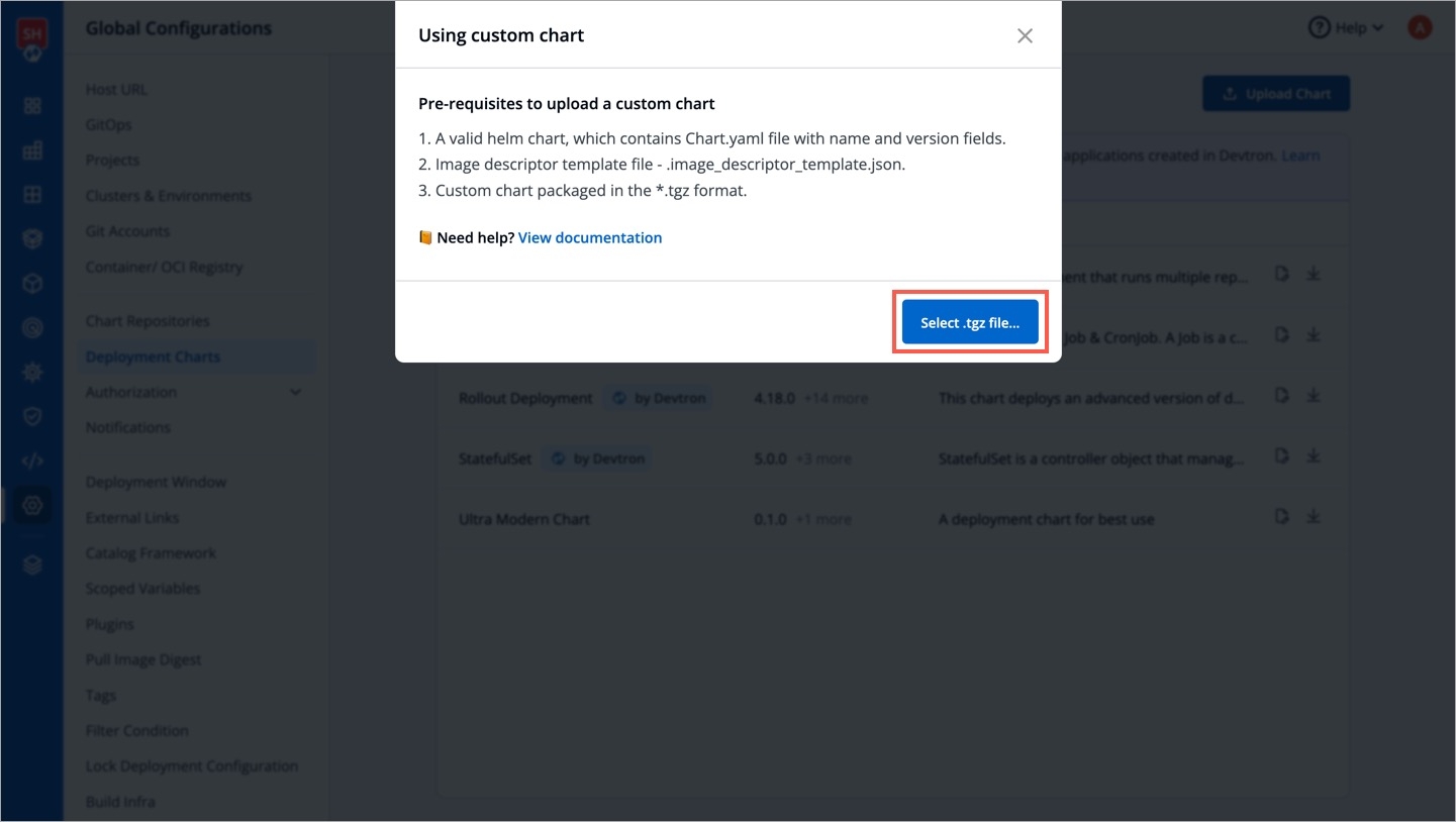 Figure 6: Upload Chart Button Click Select .tgz file and upload your packaged deployment chart (in .tgz format).