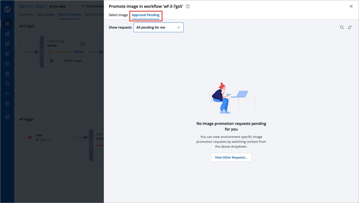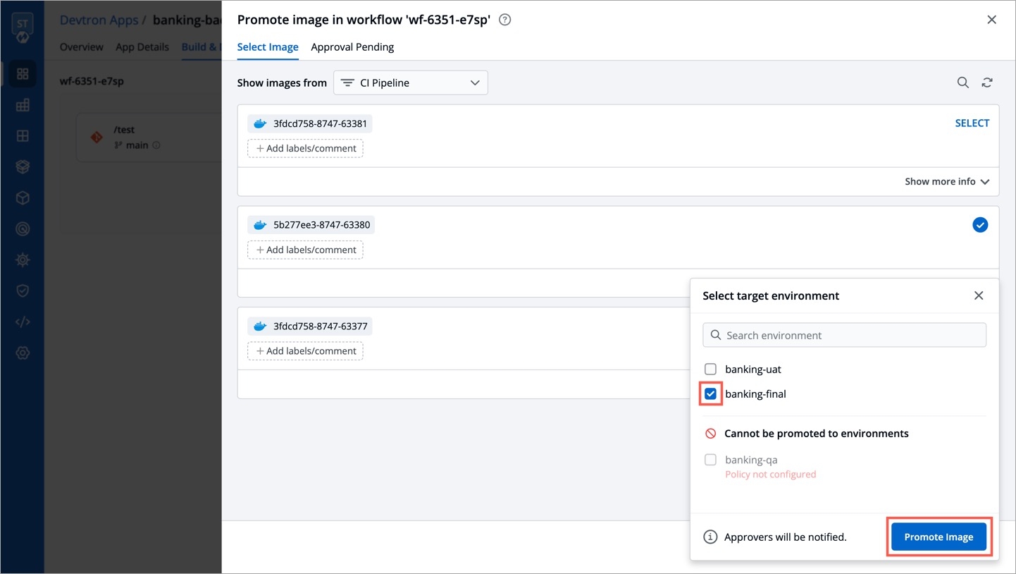 The image's promotion to the target environment now depends on the approval settings in the image promotion policy. If the super-admin has enforced an approval process, the image requires the necessary number of approvals before promotion. On the other hand, if the super-admin has not enforced approval, the image will be automatically promoted since there is no request phase involved.