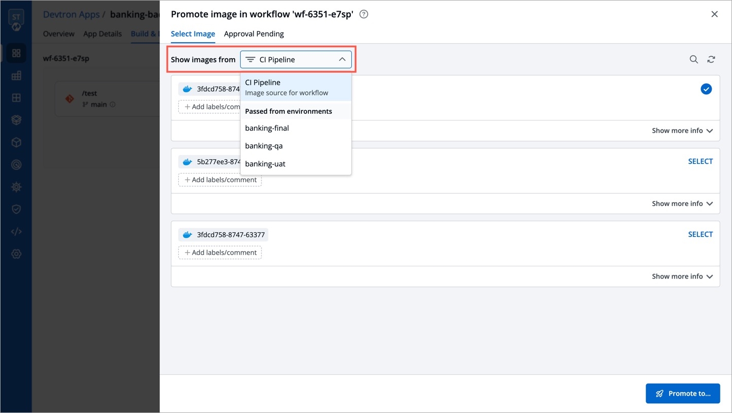 Select Imagetab, you will see a list of images. Use the Show Images from dropdown to filter the list and choose the image you wish to promote. This can be either be an image from the CI pipeline or one that has successfully passed all stages (e.g., pre, post, if any) of that particular environment.