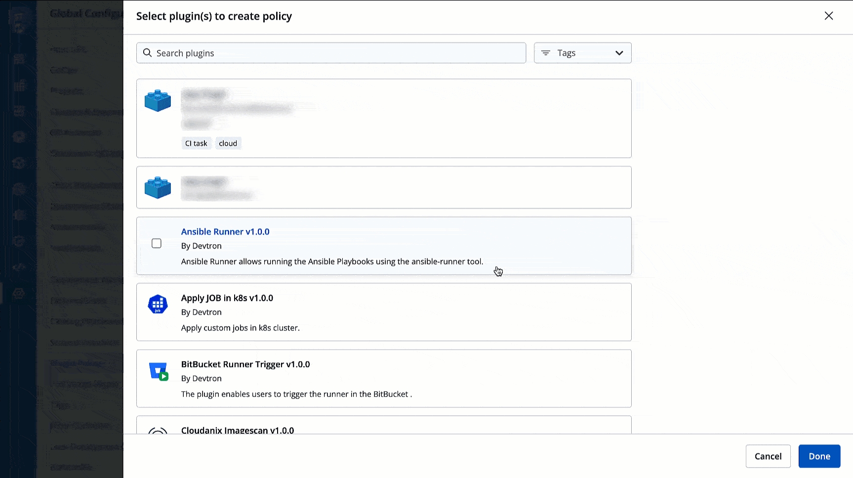 Figure 5: 'Add Plugin' Option A list of plugins will appear for you to choose from. Select one or more plugins to make them mandatory for the pipeline you selected in step 4.
