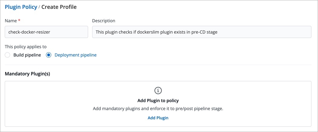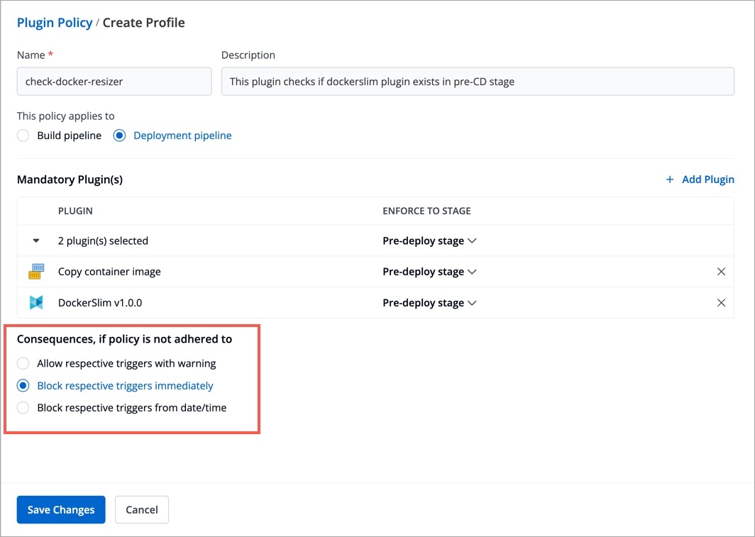 Since we created a policy that blocks the trigger of non-compliant deployment pipelines, no user can trigger the deployment unless the mandatory plugins are configured as shown below.