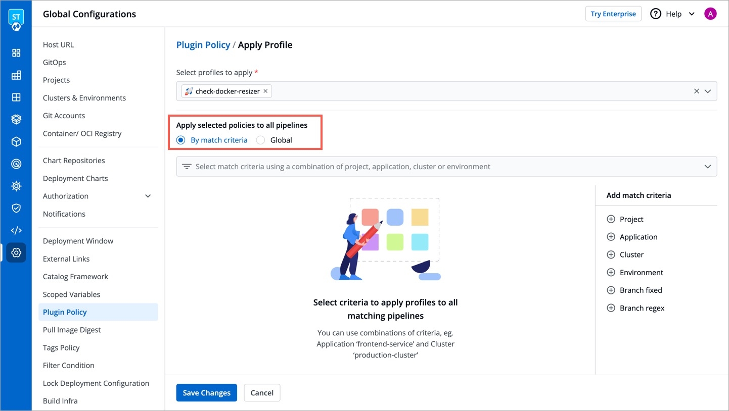 By Match Criteria - Select this option to use a combination of filters to decide the target pipelines fulfilling your criteria. Your policy will only apply to such target pipelines.