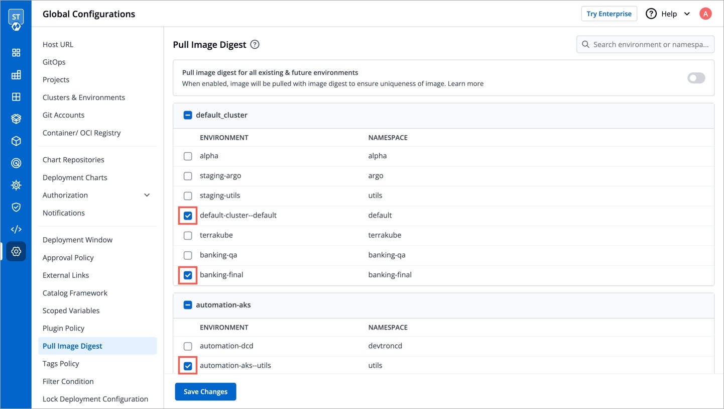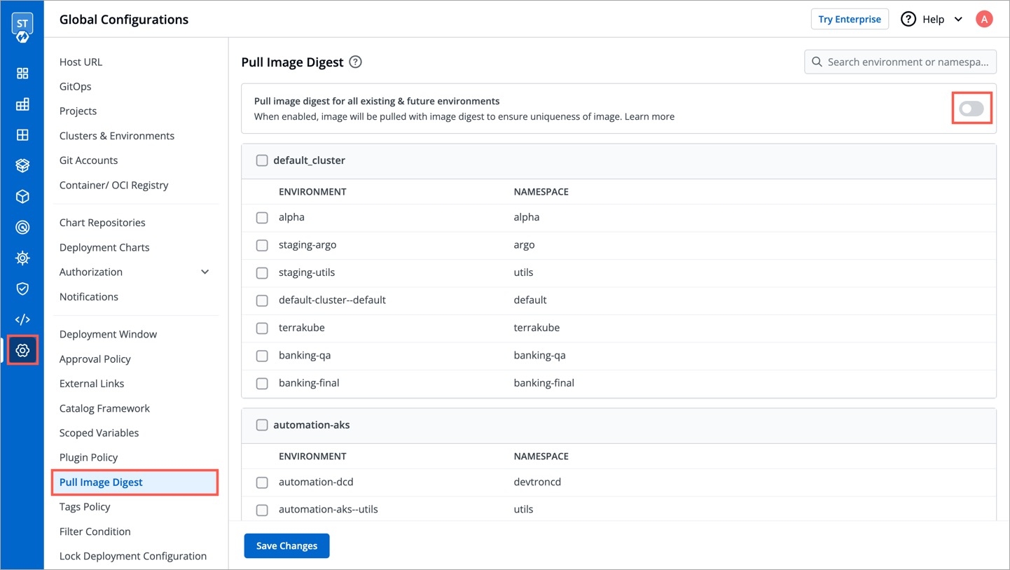 As a super-admin, you can decide whether you wish to enable pull image digest for all environments or for specific environments.