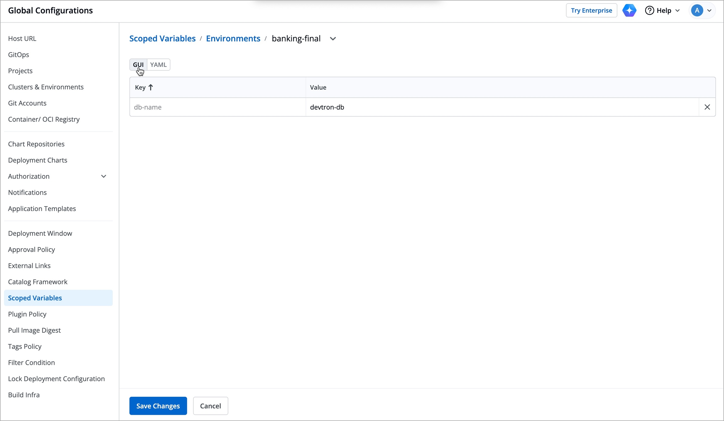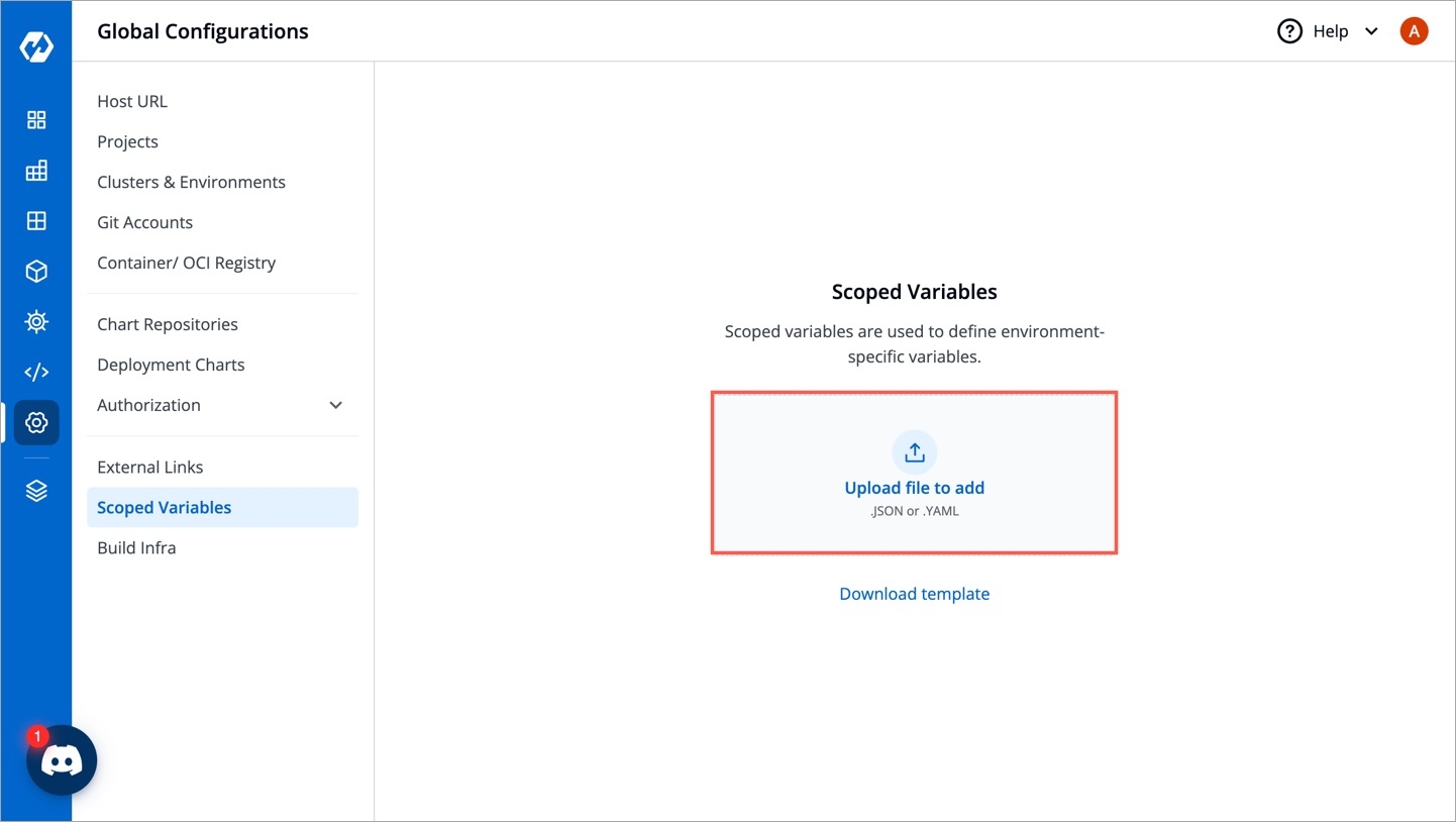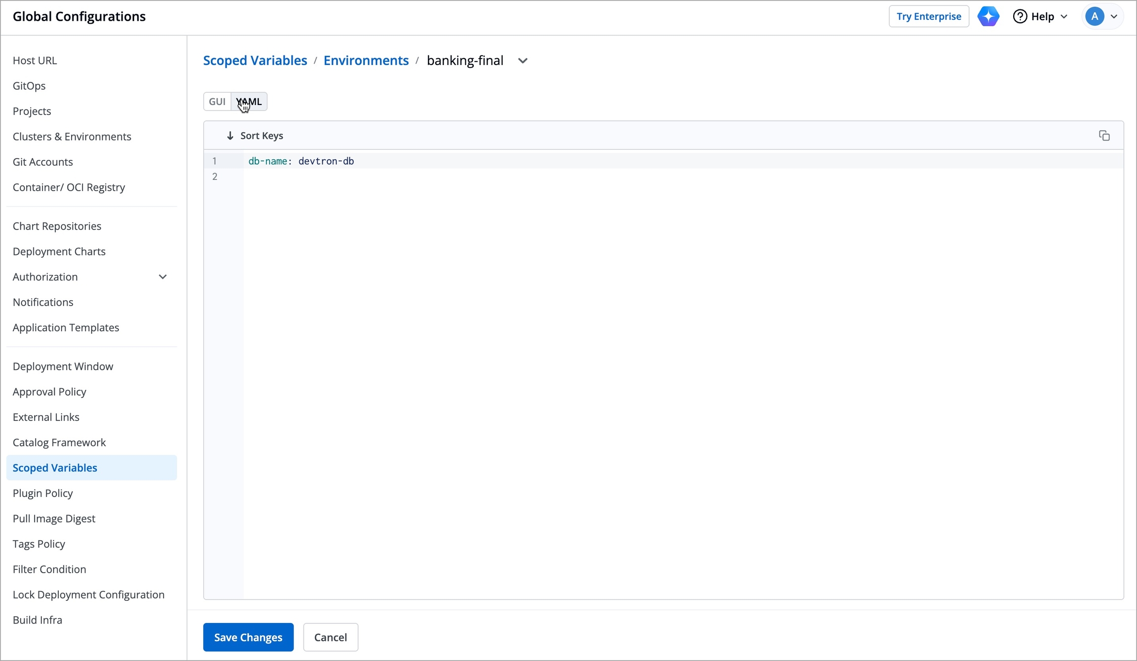 In Devtron, you can define scoped variables by using a YAML template. It will contain a schema for defining the scoped variables.