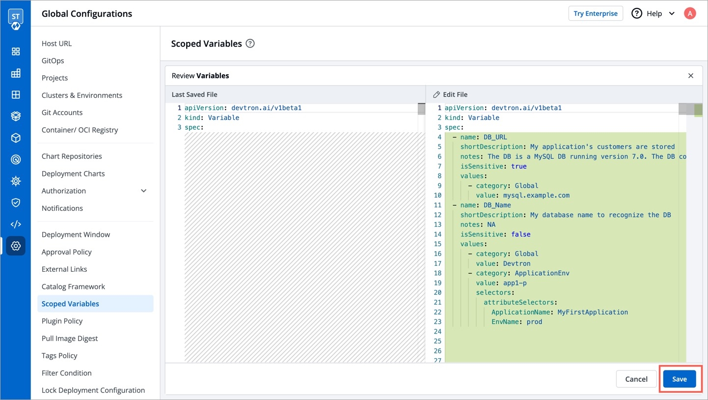 If you wish to add, update or delete the existing scoped variables, you can edit the existing saved YAML configuration using any of the following methods: