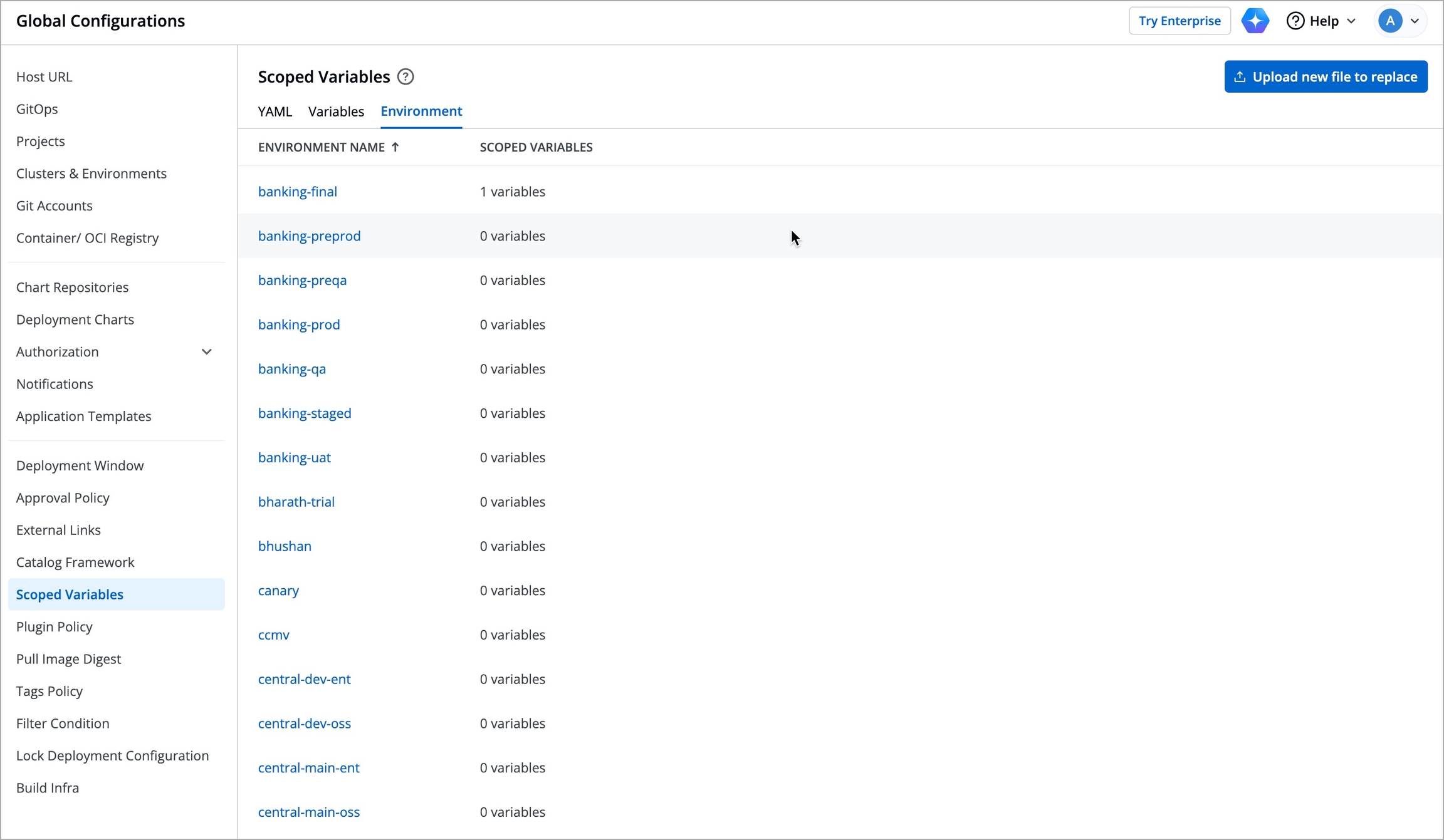 Defining YAML snippets as the value of a scoped variable will help you to reuse YAML configuration across multiple applications or environments. Scoped variables with YAML snippets can be changed based on the context (category) such as Global, Cluster, Environment, Application, Environment+Application.