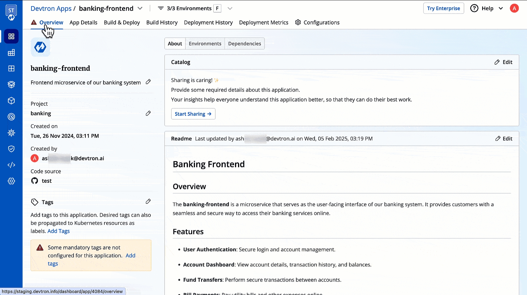 If an existing application belongs to a project where mandatory tags are enabled along with deployment restrictions, if the user does not provide values for the mandatory tags, they cannot deploy that app to the intended environment (check step 9 of adding tags).