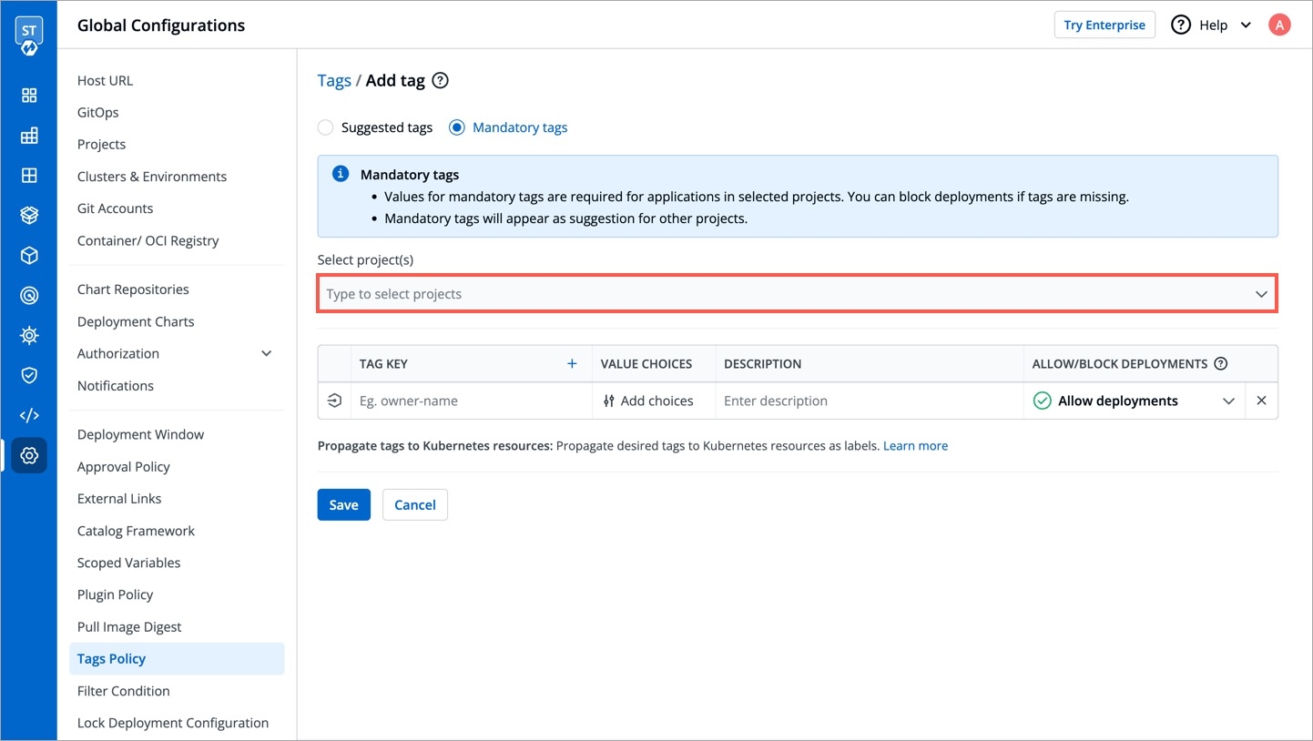 Block deployment stages of all environments - This will prevent the user from deploying an existing application to all environments if mandatory tags are not configured.