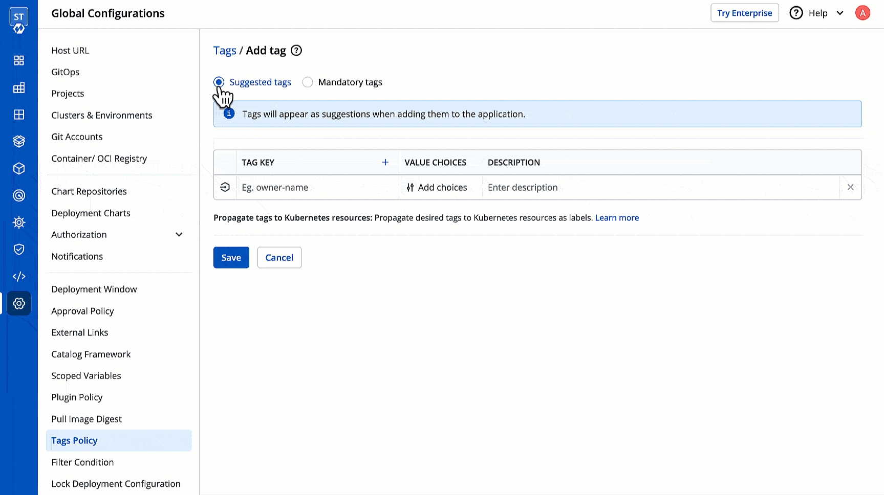 The Tags Policy feature in Devtron allows you to enforce a tag that must be provided before application creation or before deployment to an environment. For example, you can create a tag named team and if it is propagated as labels to Kubernetes resources, you can easily audit the team-wise usage and resource consumption by its tag. Additionally, you can enforce deployment-specific rules for your applications if required tags are missing.