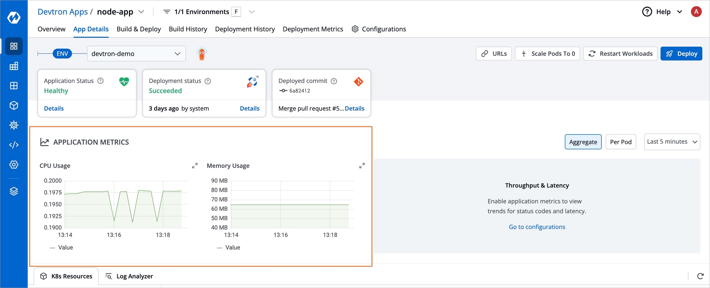 Figure 9: Enable Application Metrics Now, you can track all your application metrics by navigating to Applications and going to the App Details page of your Devtron App as shown below.
