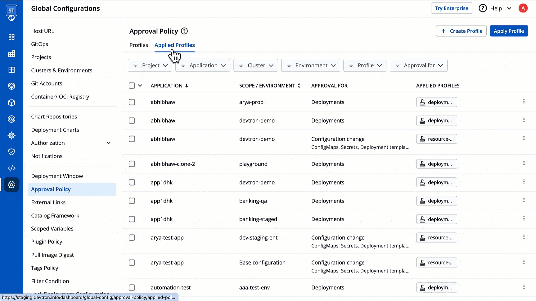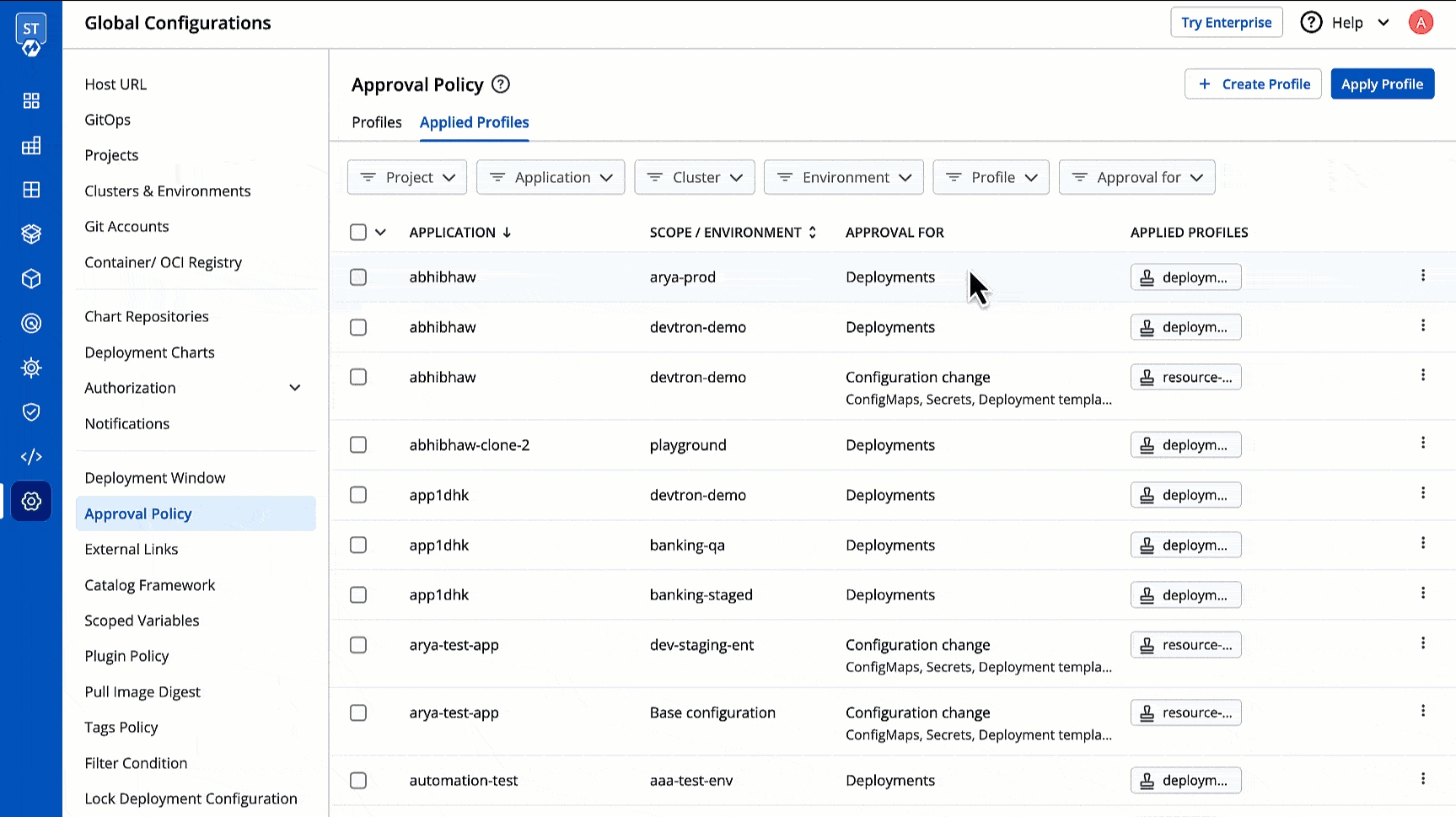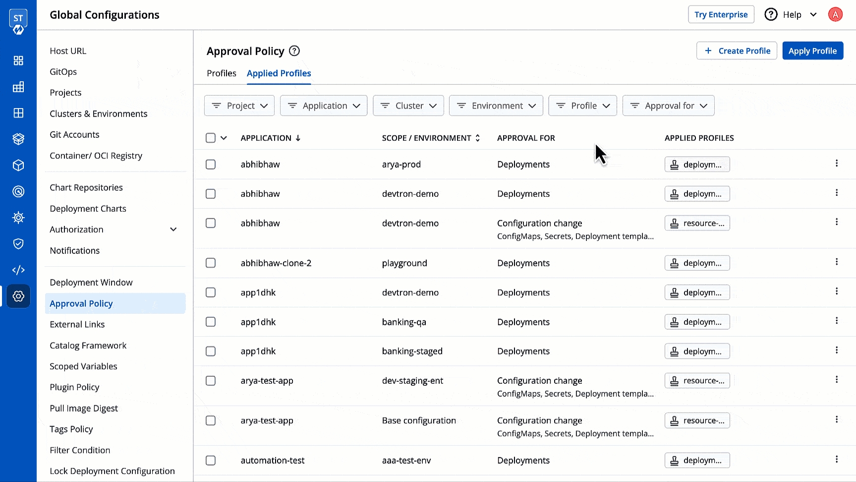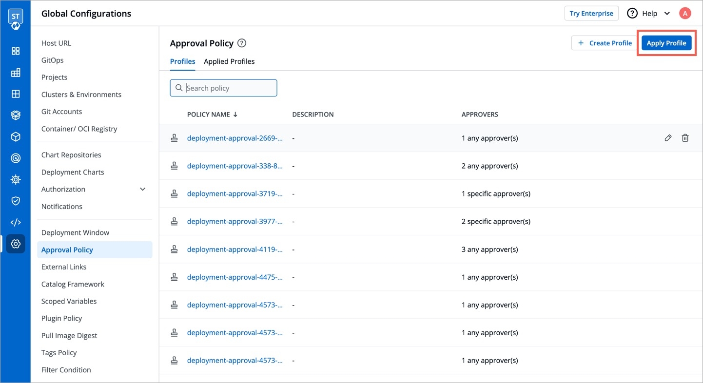 If you have already applied policies to a scope (e.g., Global, Cluster, Application) and wish to delete all of them from that given scope, follow the steps below. Note: This will not delete the approval policy you originally created. Moreover, deployment pipelines may still continue inheriting profiles from higher scopes (e.g., Global, Cluster, Application).