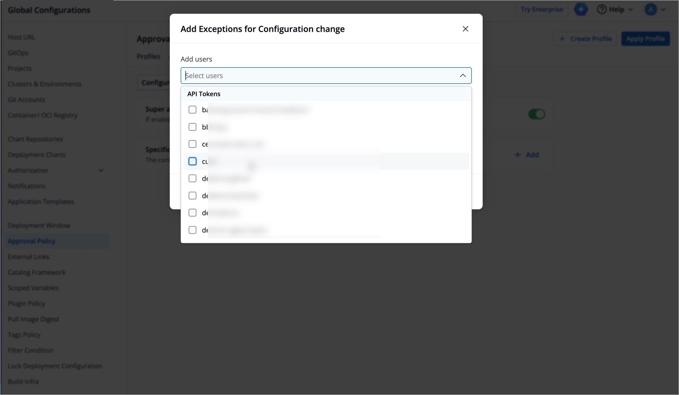 Configuration Change: Exempts the selected users, user groups, and API tokens to edit base configurations such as Deployment Templates, ConfigMaps, or Secrets without requiring approvals.