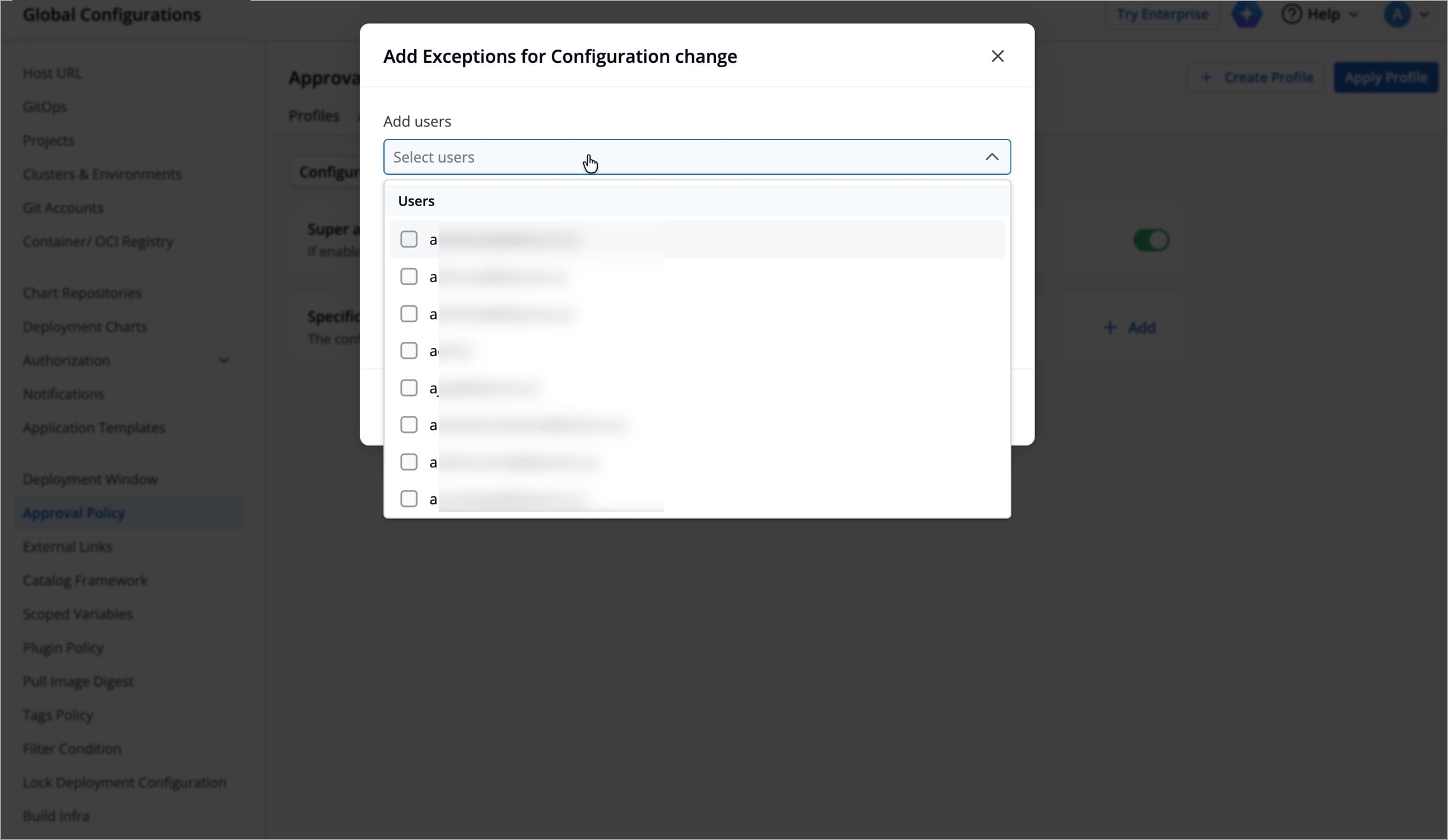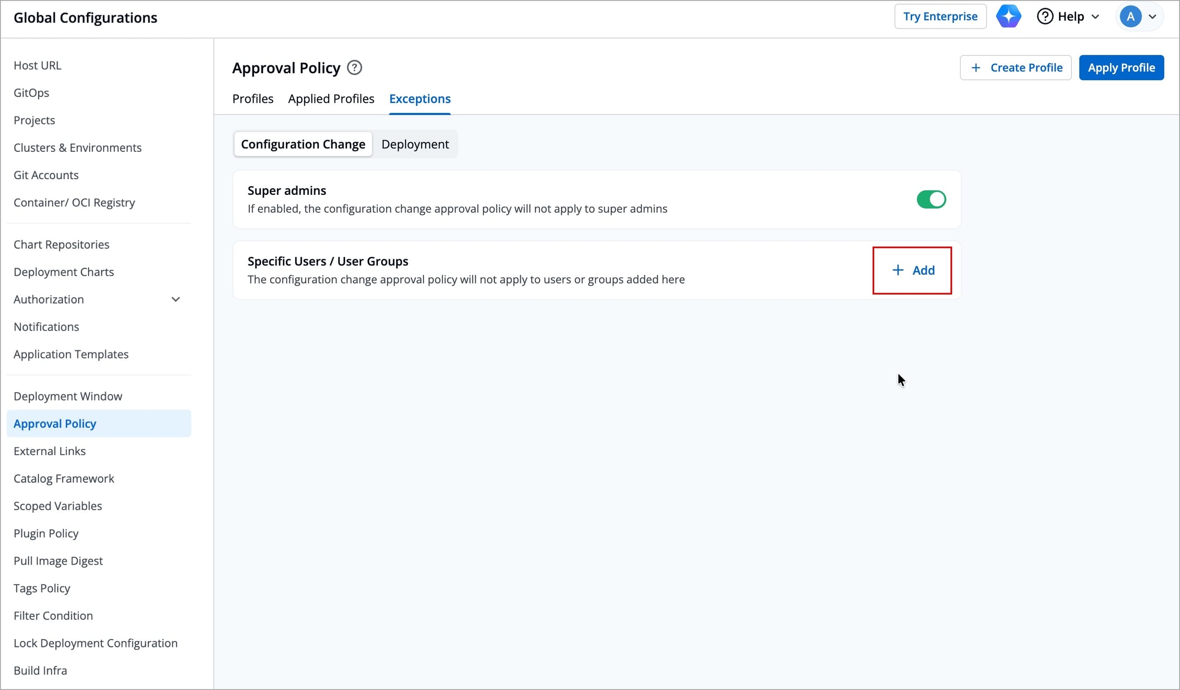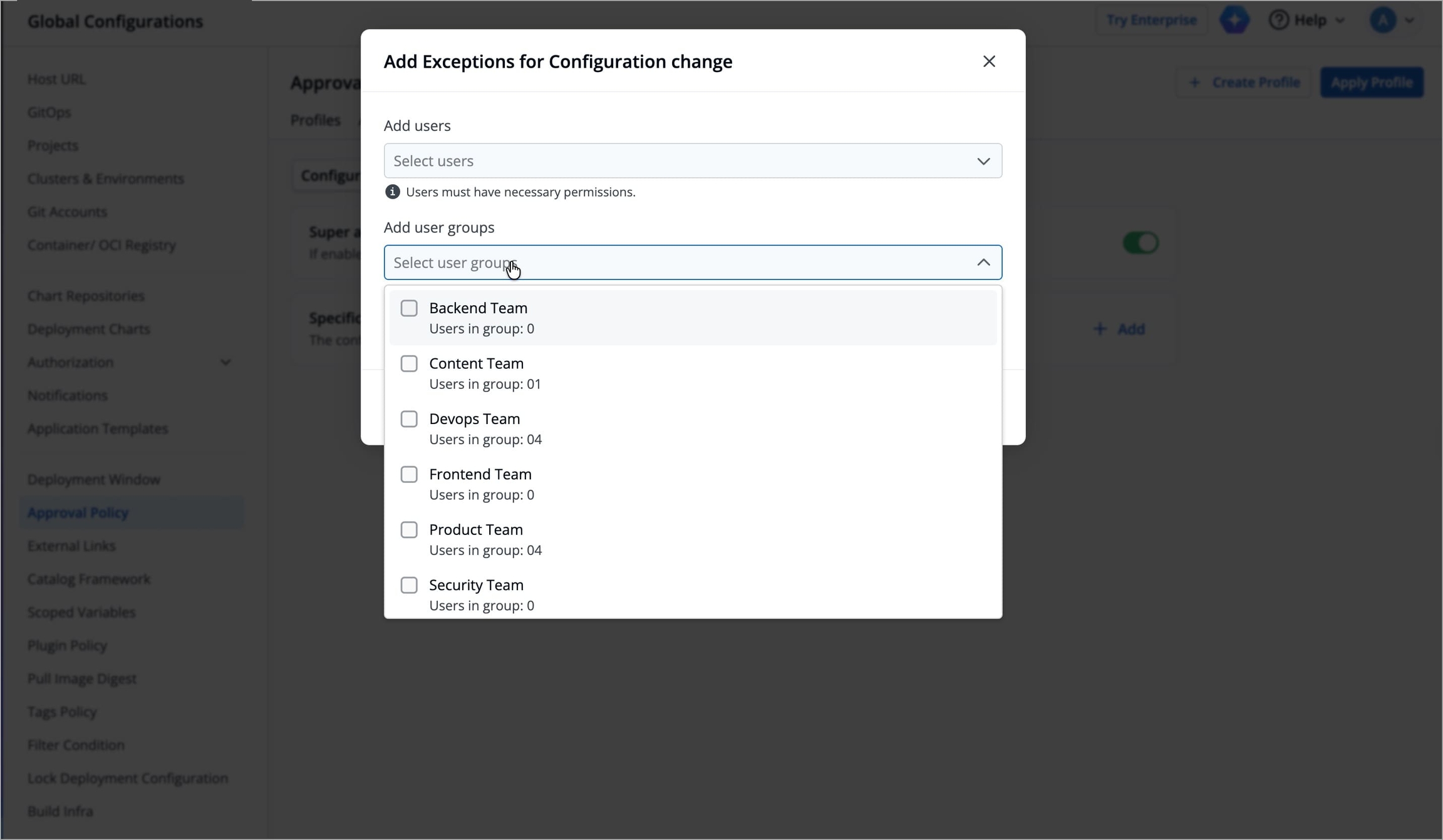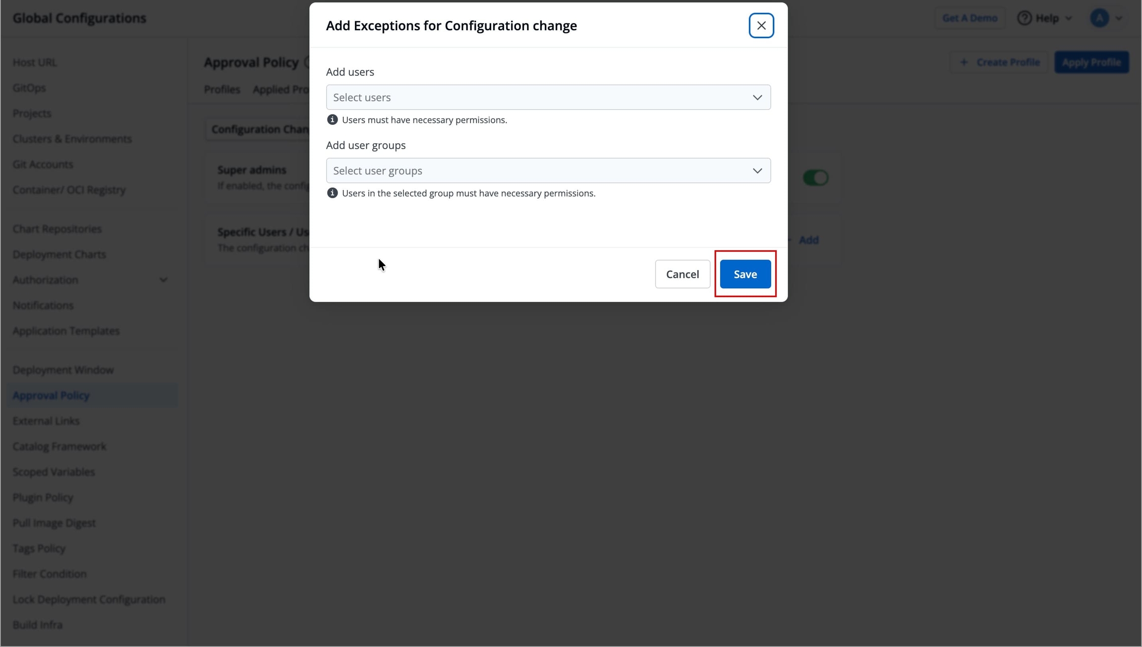 After configuring exceptions, super-admins and specific users / user groups can make configuration changes and trigger deployments without requiring any approval.