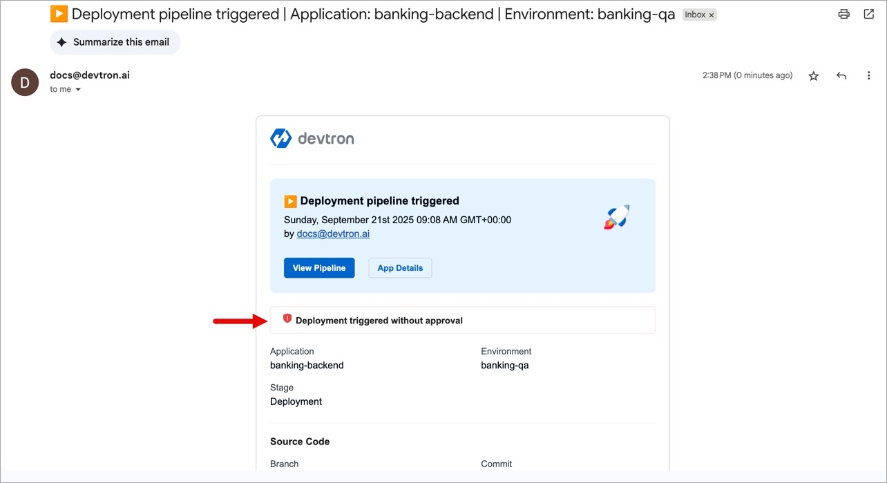 Figure 36: User with 'Configuration Approver' permissions granting approval If SES/SMTP is configured in Devtron, the approver gets notified via email. Therefore, the approver can take an action directly from the mail as shown below.