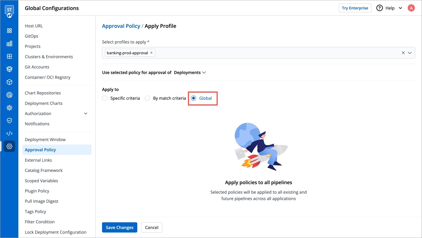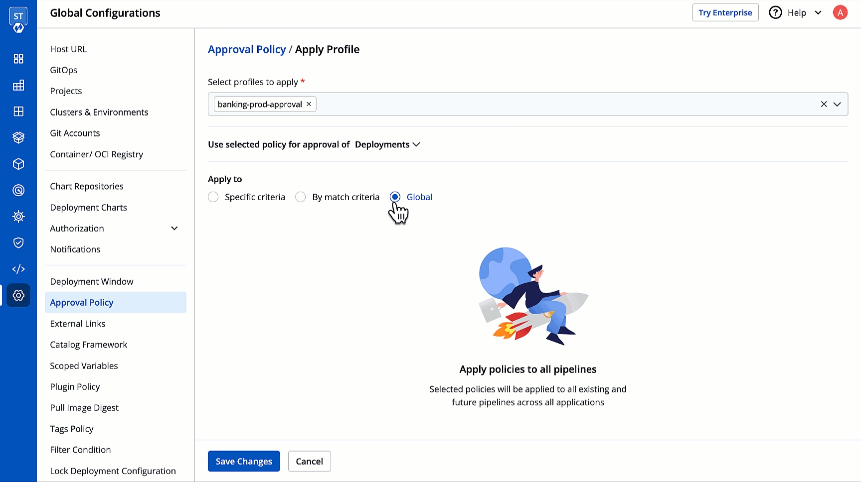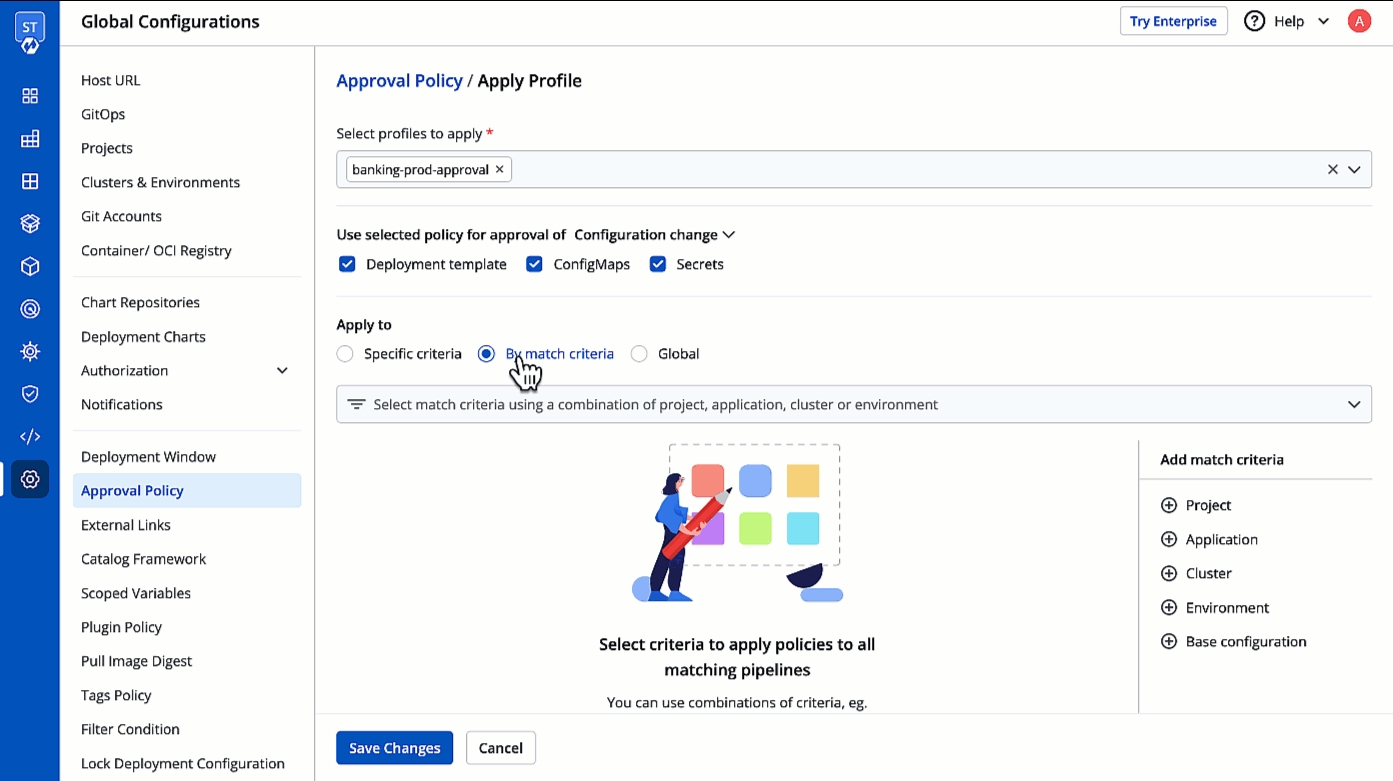 Figure 12b: Match Criteria for 'Configuration Change' Approval Global - Select this option to apply your chosen policies to every deployment pipeline or configurations (existing and future) of all applications in all clusters.
