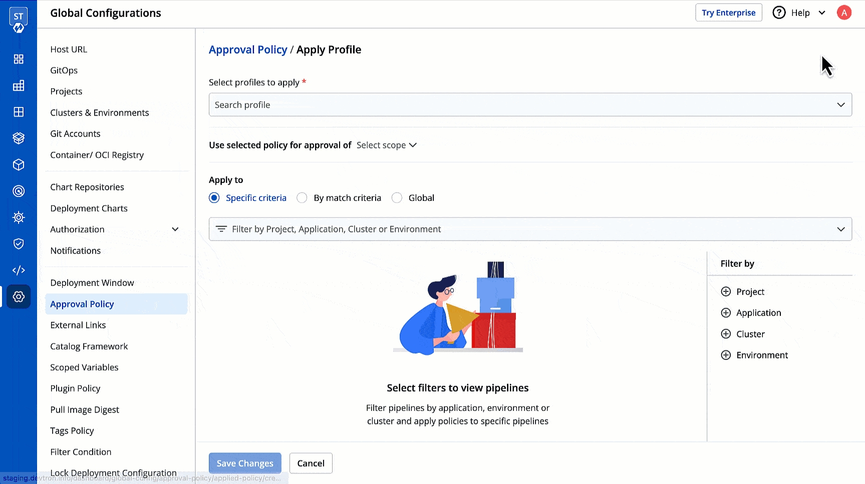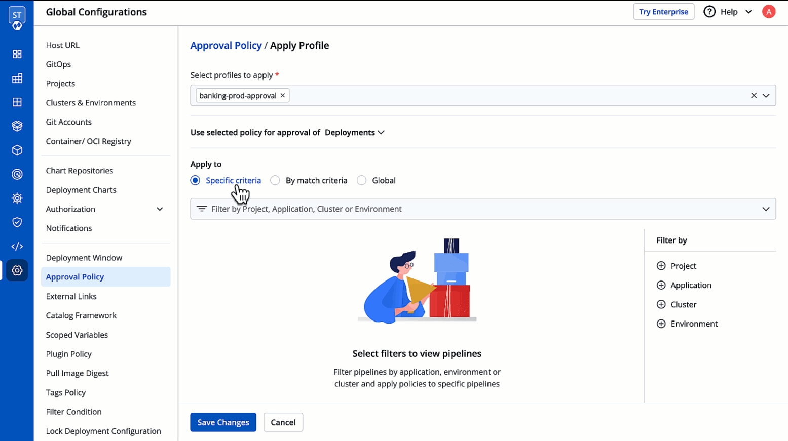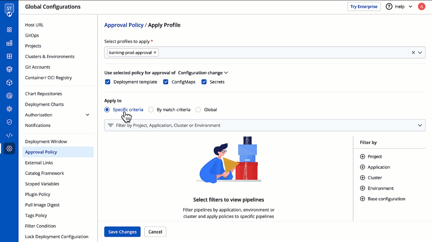 Figure 12b: Match Criteria for 'Configuration Change' Approval Global - Select this option to apply your chosen policies to every deployment pipeline or configurations (existing and future) of all applications in all clusters.