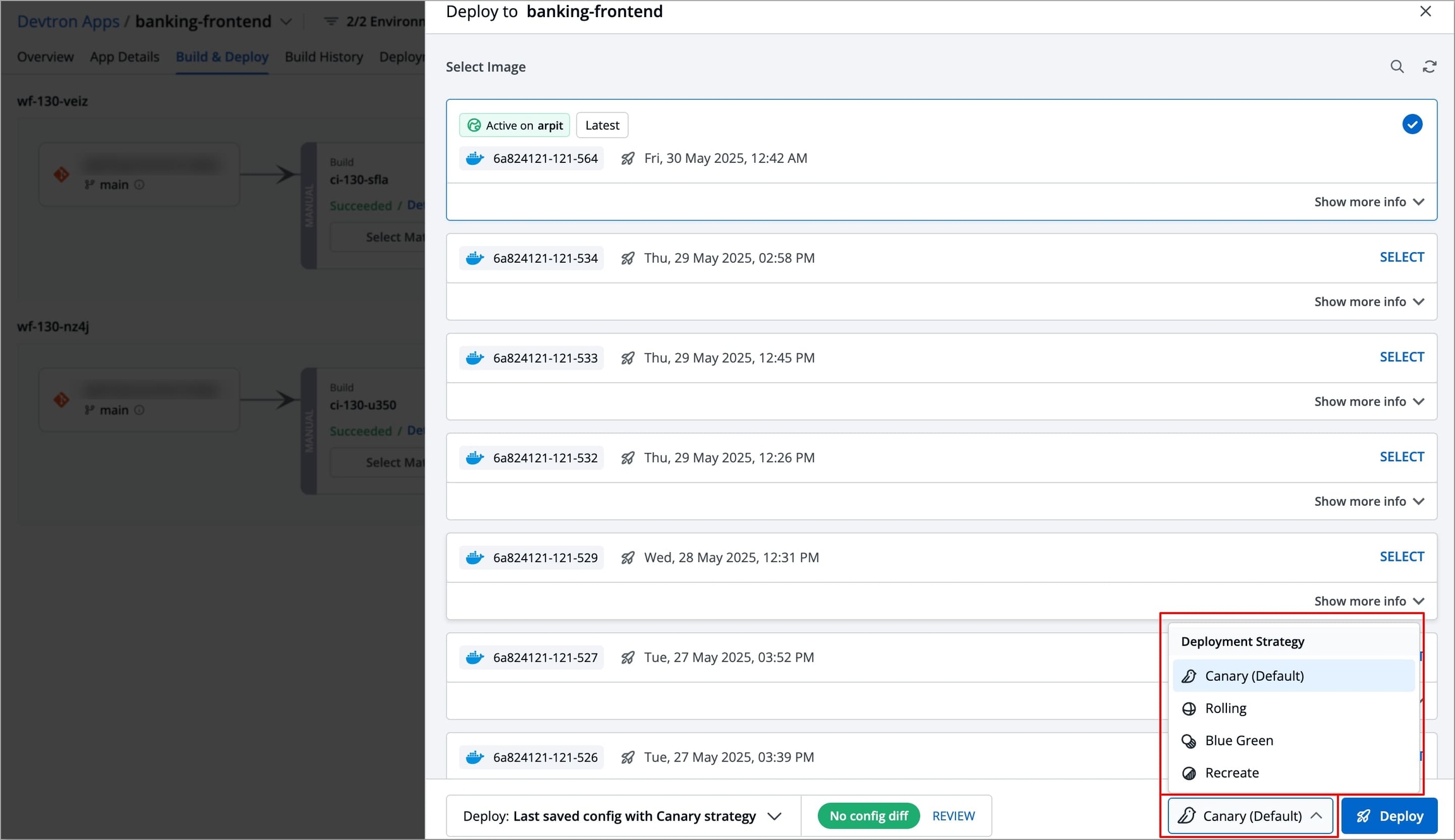 Figure 8: Selecting Default Deployment Strategy If in any scenario such as deploying a hotfix, if you need to use a different deployment strategy other than the default, you can change it from Build & Deploy section while triggering the deployment.