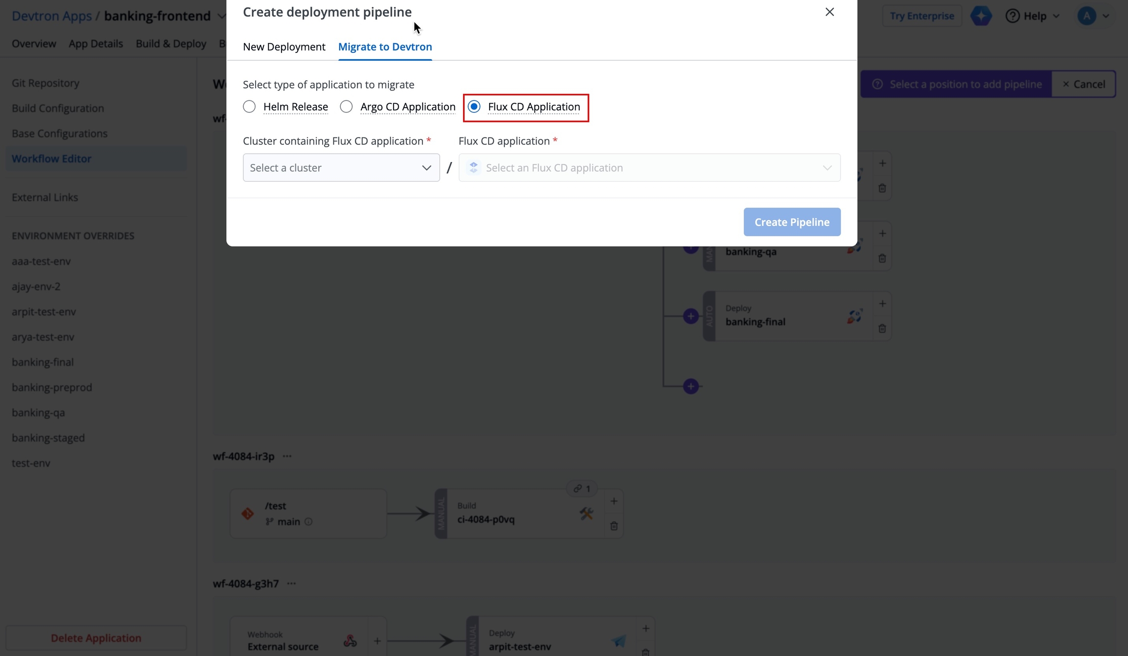 Figure 31: Creating CD Pipeline for Flux CD App Once the pipeline is created, you may go to Build & Deploy to trigger the pipelines. Your Flux CD app would be deployed using Devtron.