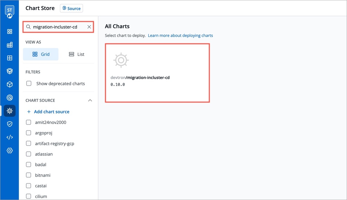kubectl delete pod -l app=devtron -n devtroncdAgain, navigate to the chart store and search for the "migration-incluster-cd" chart.