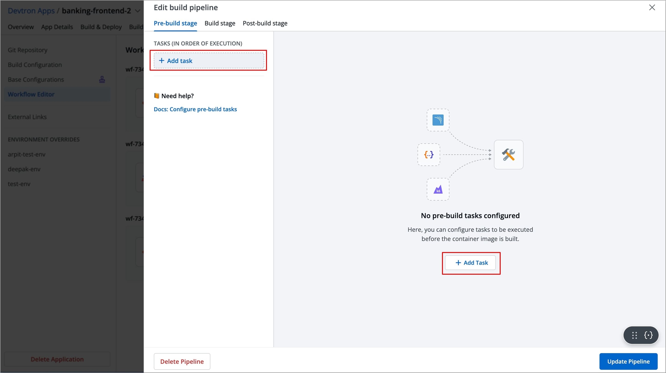 Figure 5: Configuring the task Click Update Pipeline. The pre/post task will be executed when you trigger the next build or deployment.