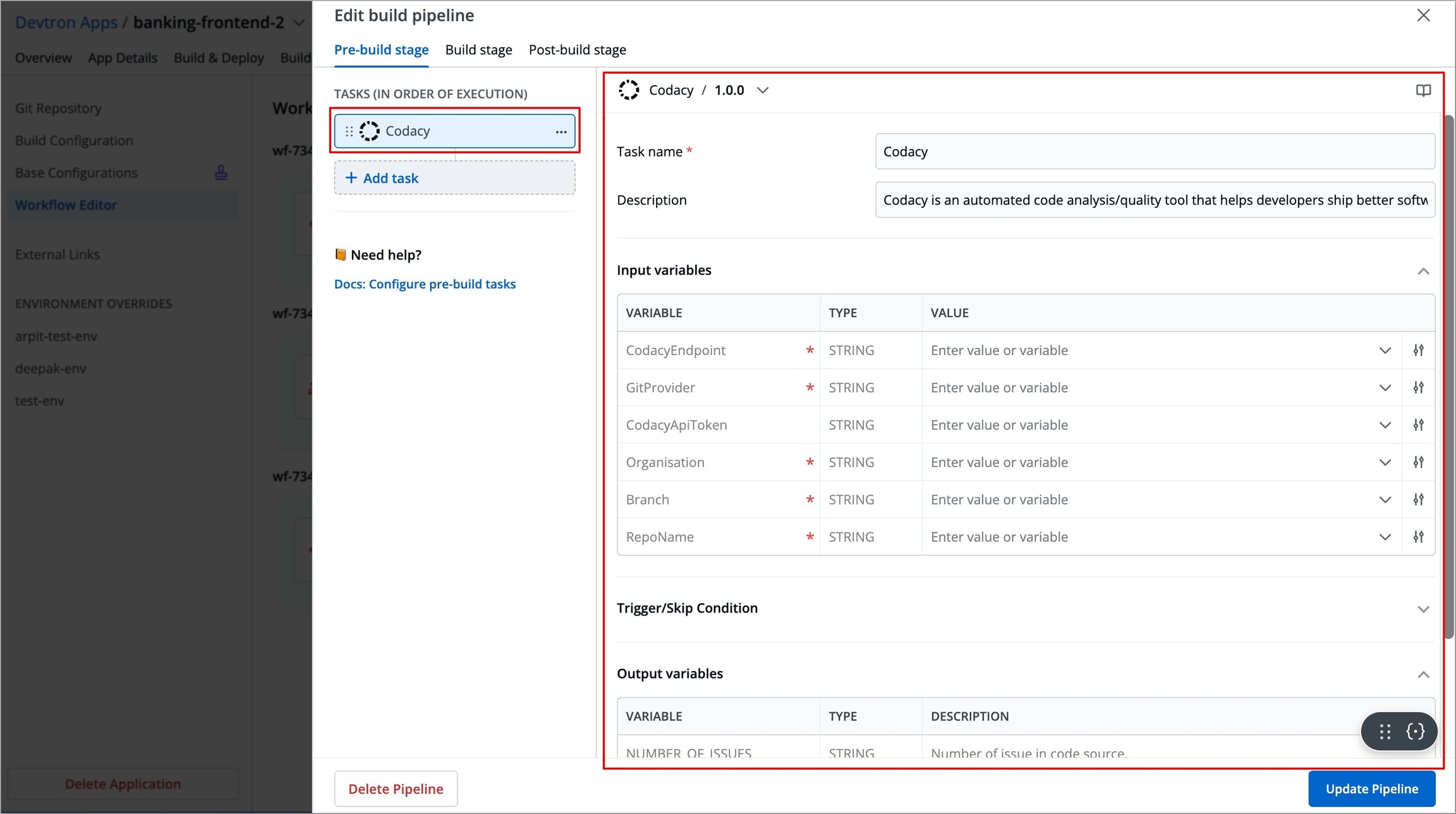 To create a task using preset plugins, let's take Codacy as an example and configure it in the Pre-Build stage in the build pipeline for finding bugs, detecting dependency vulnerabilities, and enforcing code standards.