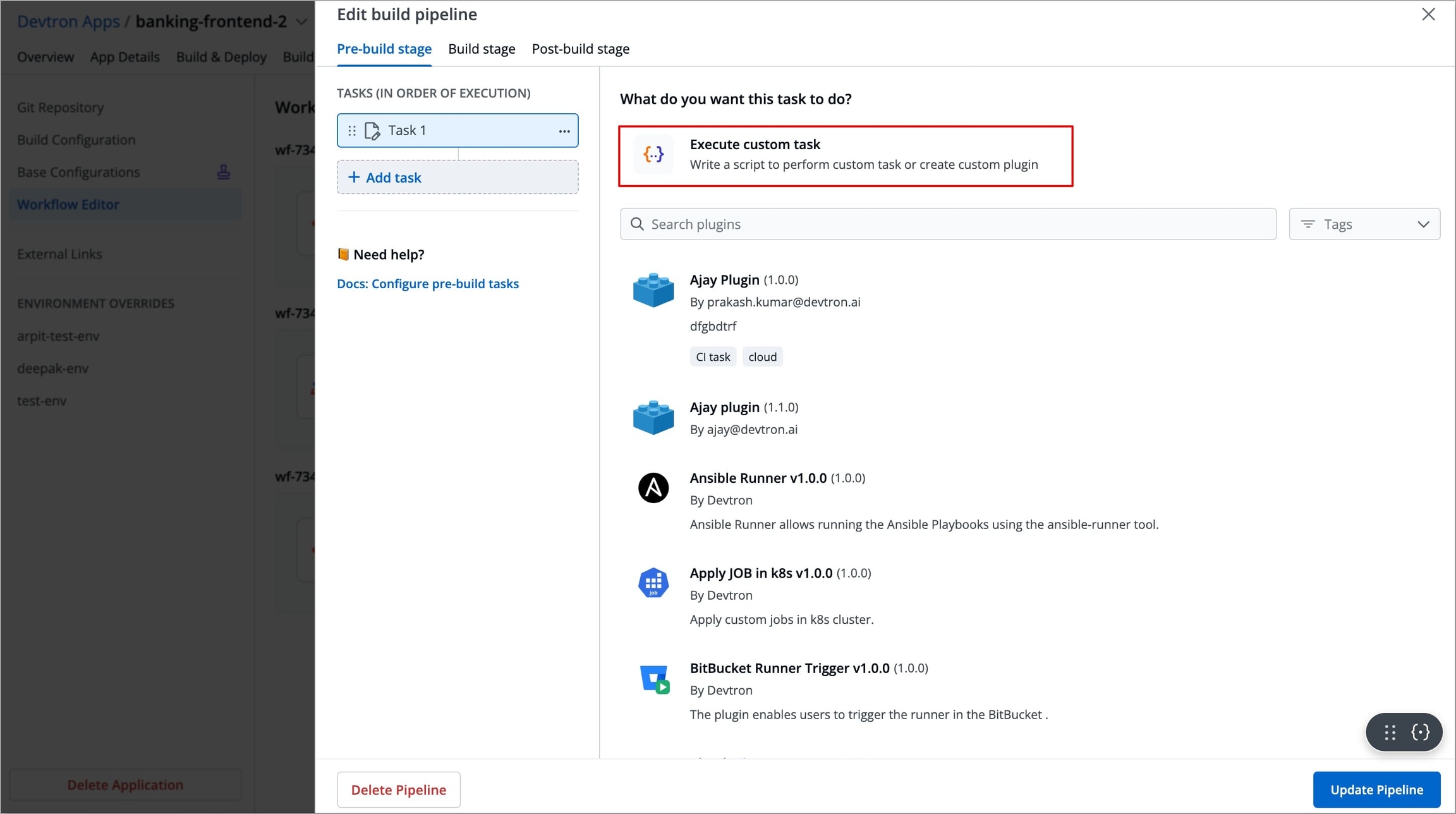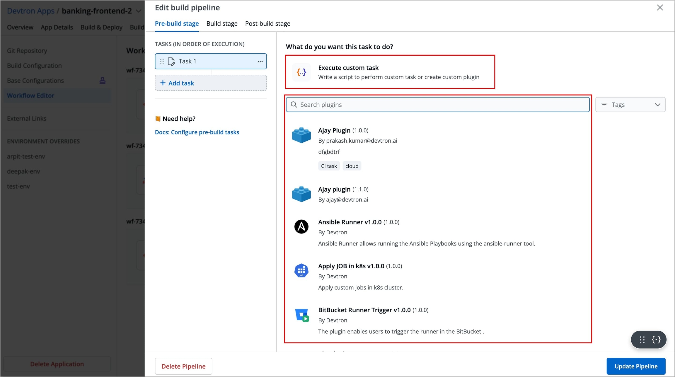 Similarly, you can configure any task with a preset plugin in Pre/post-build stages or pre/post-deployment stages.