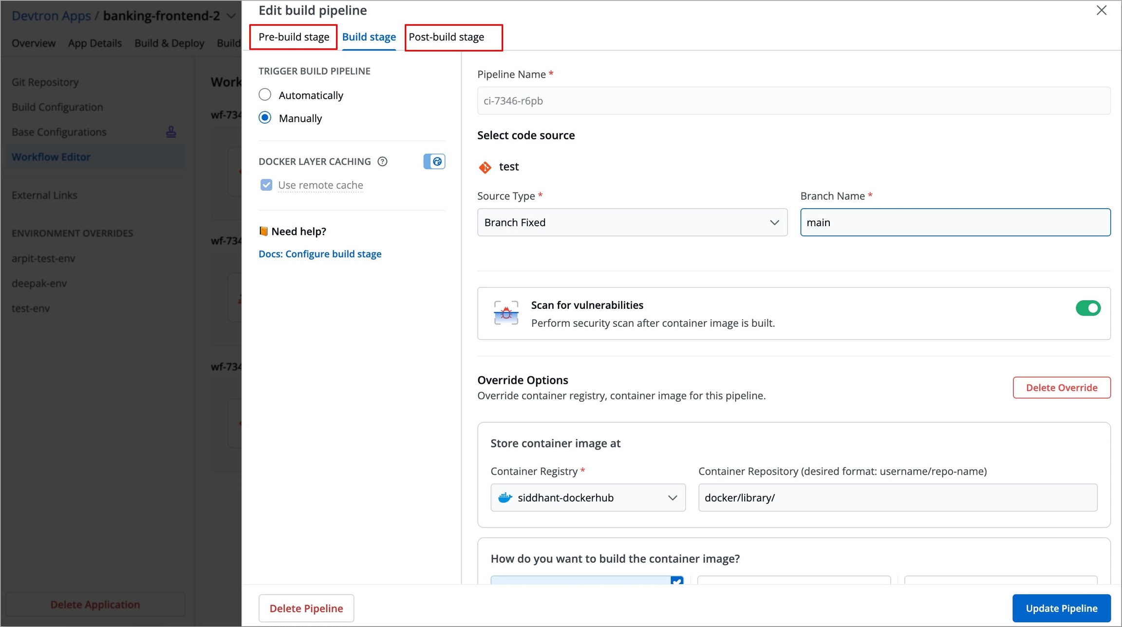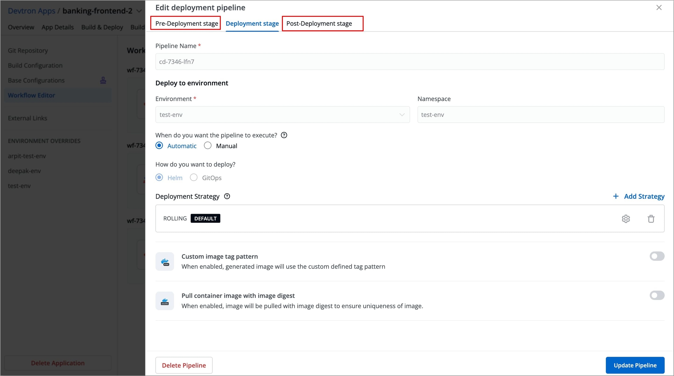 Figure 2: Pre/Post-build stages Deployment pipelines: On the Edit deployment pipeline window, select the Pre-Deployment stage or Post-Deployment stage tab.