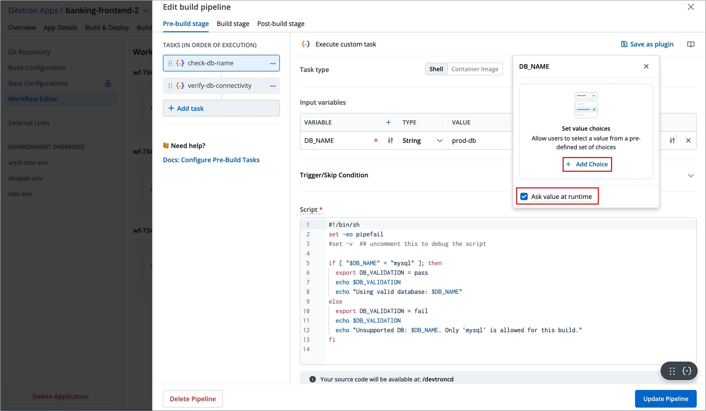 Let's take an example of a Shell task in the Pre-Build stage that ensures the database configured is prod-db. If the configured database is anything else, the build should stop.