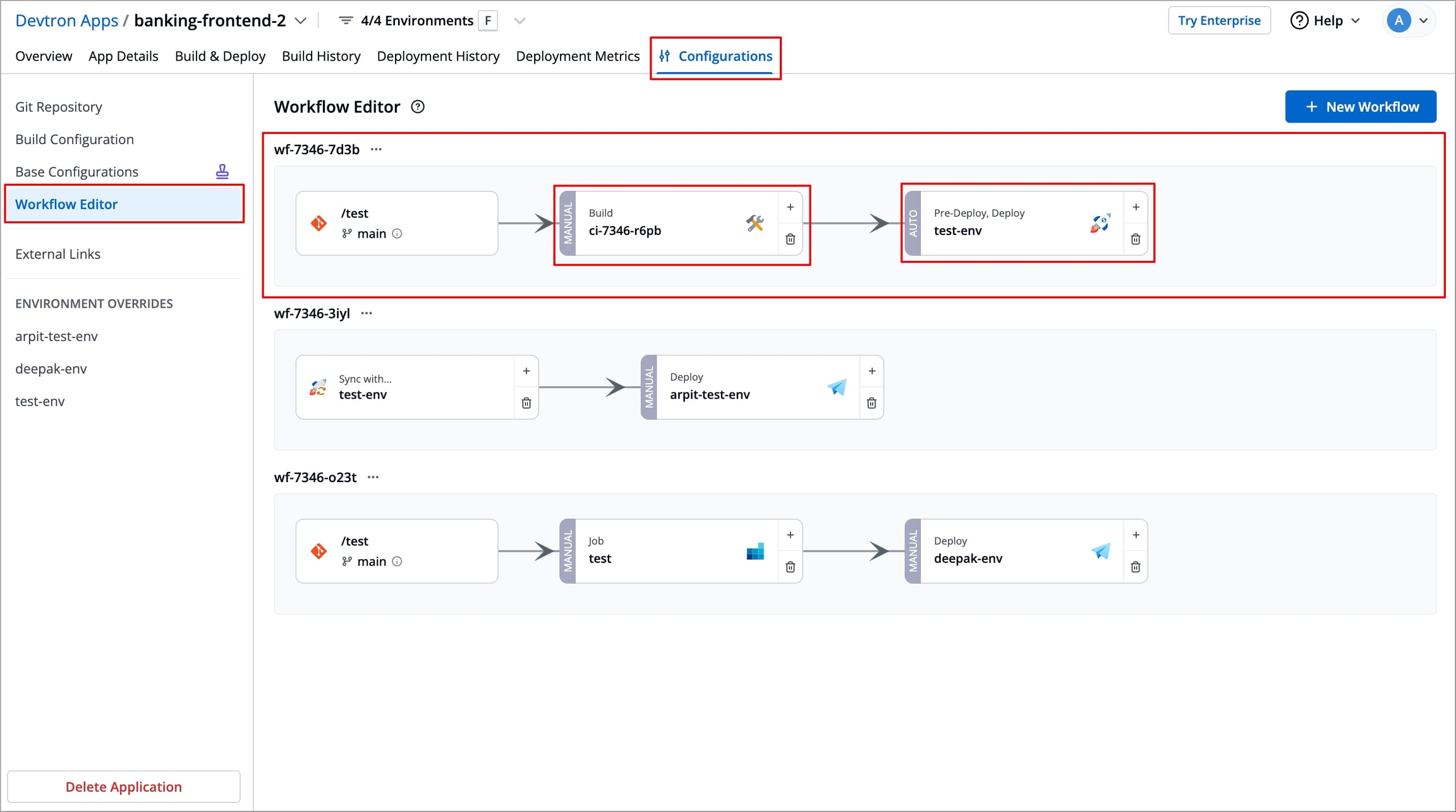 Navigate to Configurations → Workflow Editor of your Devtron App.