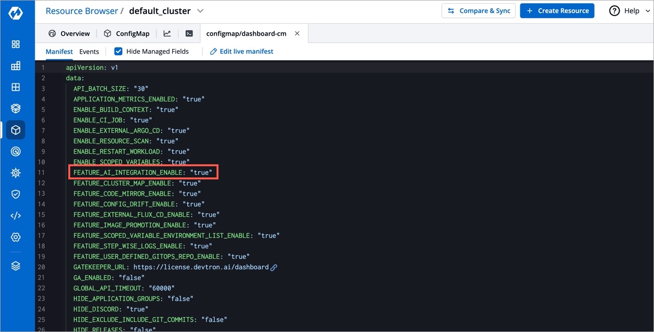 To enable AI integration via feature flag, check if the below entry is present in the ConfigMap (create one if it doesn't exist).