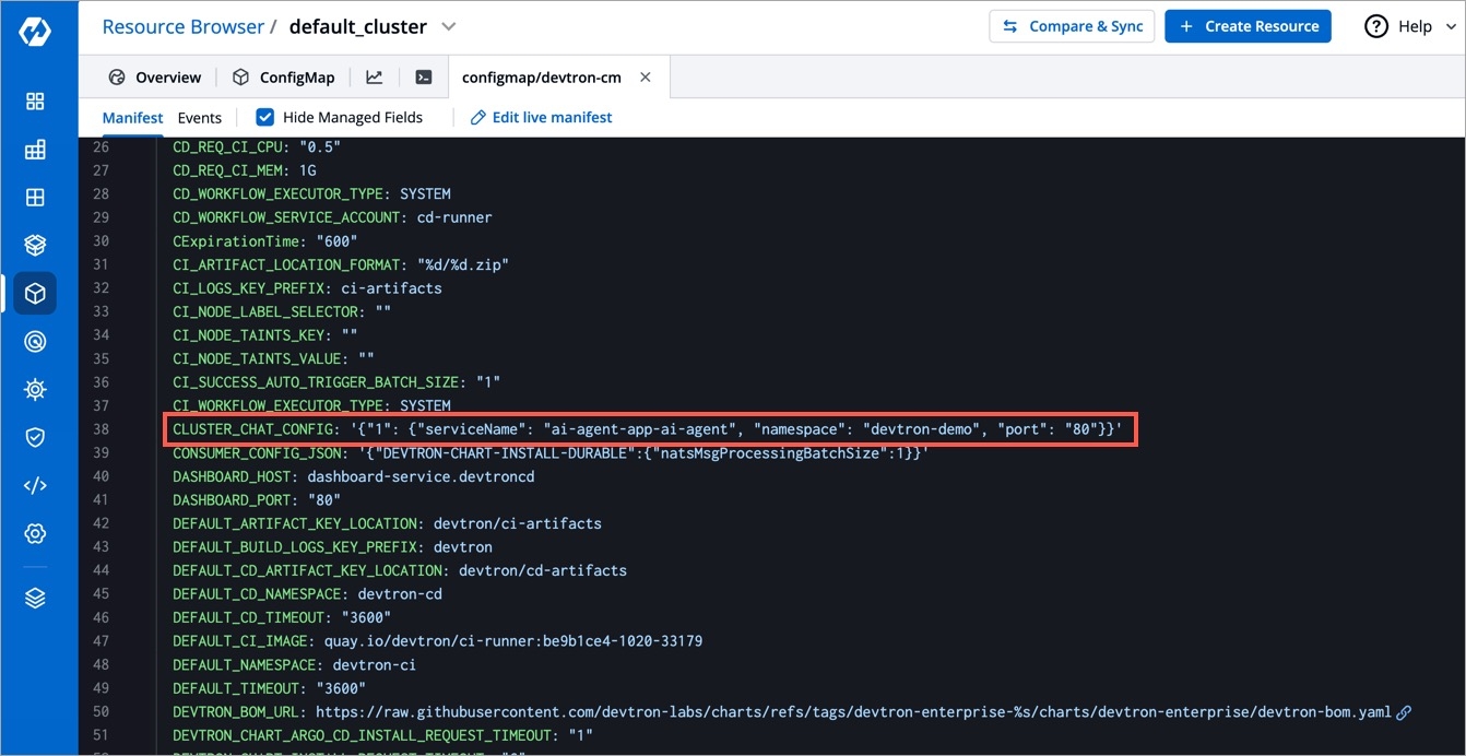 Ensure the below entry is present in the ConfigMap (create one if it doesn't exist). Here you can define the target cluster and the endpoint where your Devtron AI service is deployed: