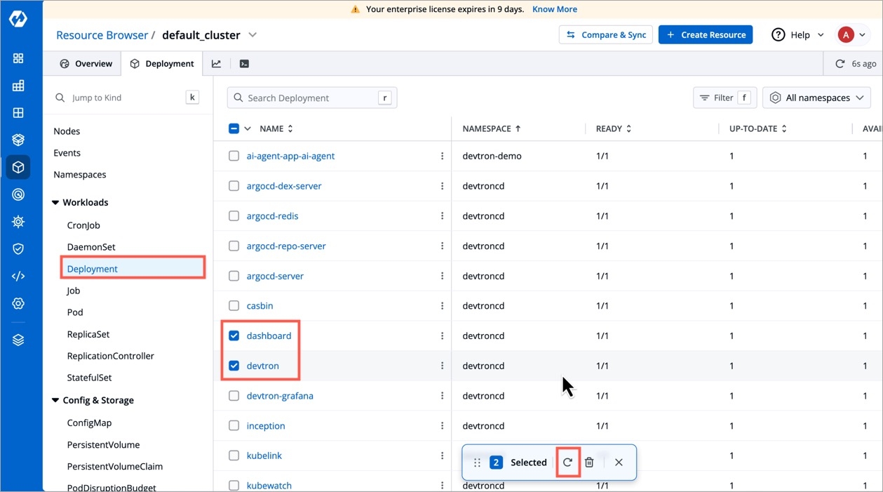 Figure 7: Restart 'devtron' and 'dashboard' deployment workloads