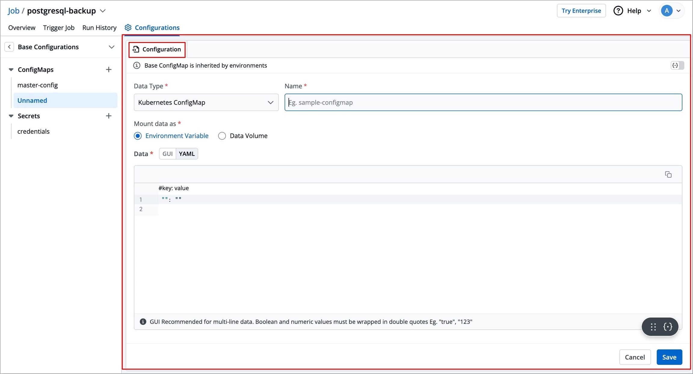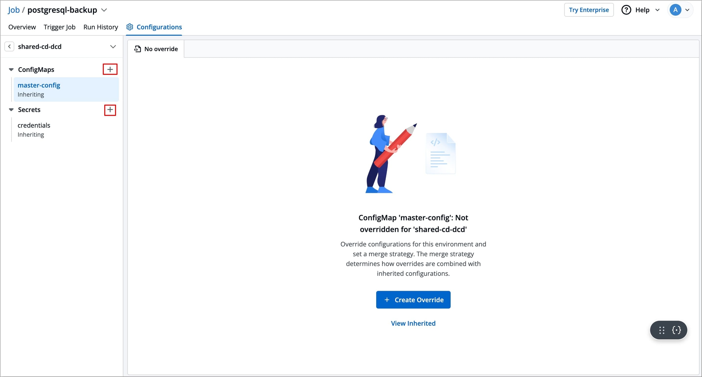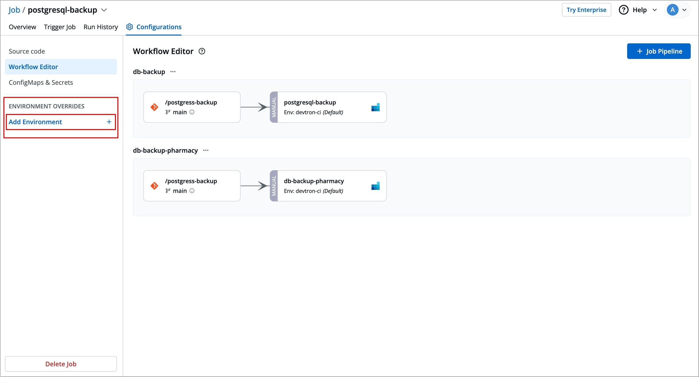 When you add a job pipeline to a job's workflow, each environment configuration initially inherits the ConfigMap and Secret from the Base Configurations of the job.