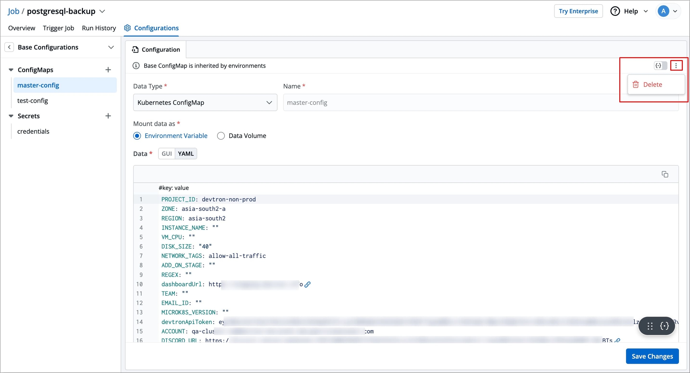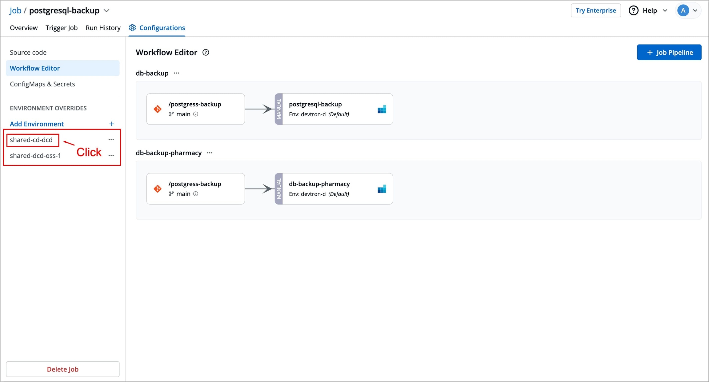 If you want to have environment-specific ConfigMaps & Secrets, use Environment Override to override them for specific environments or create new environment-specific ConfigMaps & Secrets. At the time of execution, Devtron will pick environment-specific ConfigMaps & Secrets according to the environment in which the job is executed and pass them to your job pods.