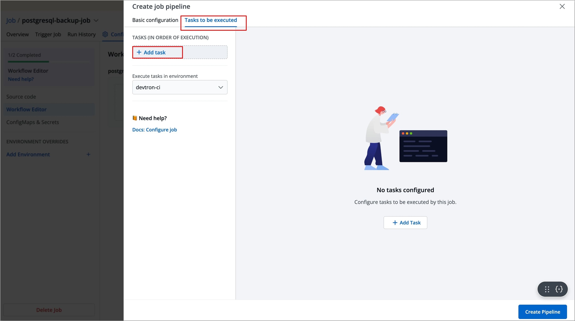 Navigate to Tasks to be executed in the Create job pipeline window.