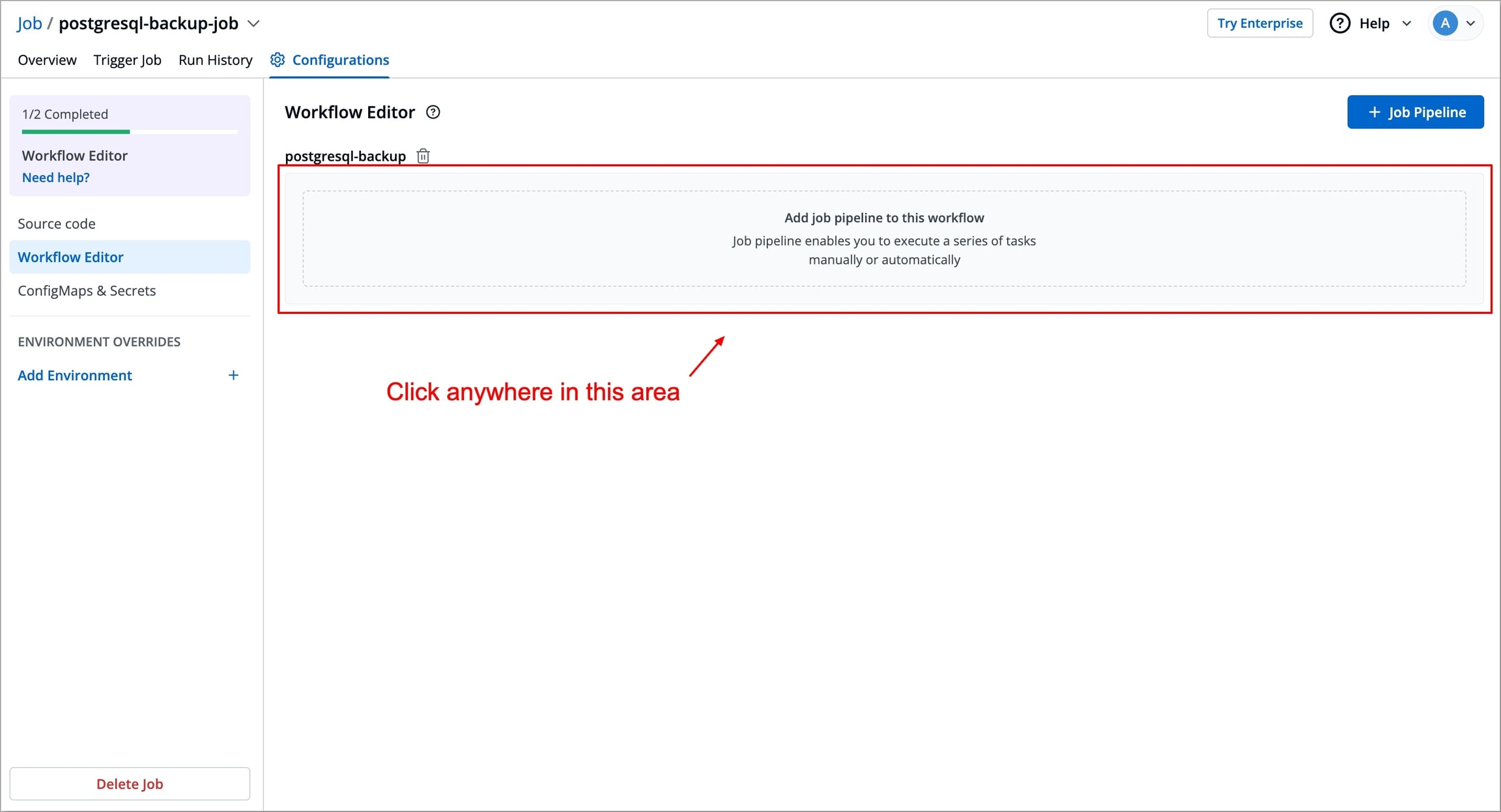 Figure 1: Selecting Workflow Editor Click + Job Pipeline to create a new Job workflow. A pop-up Create job workflow will appear, asking you to enter a name for your Job workflow.