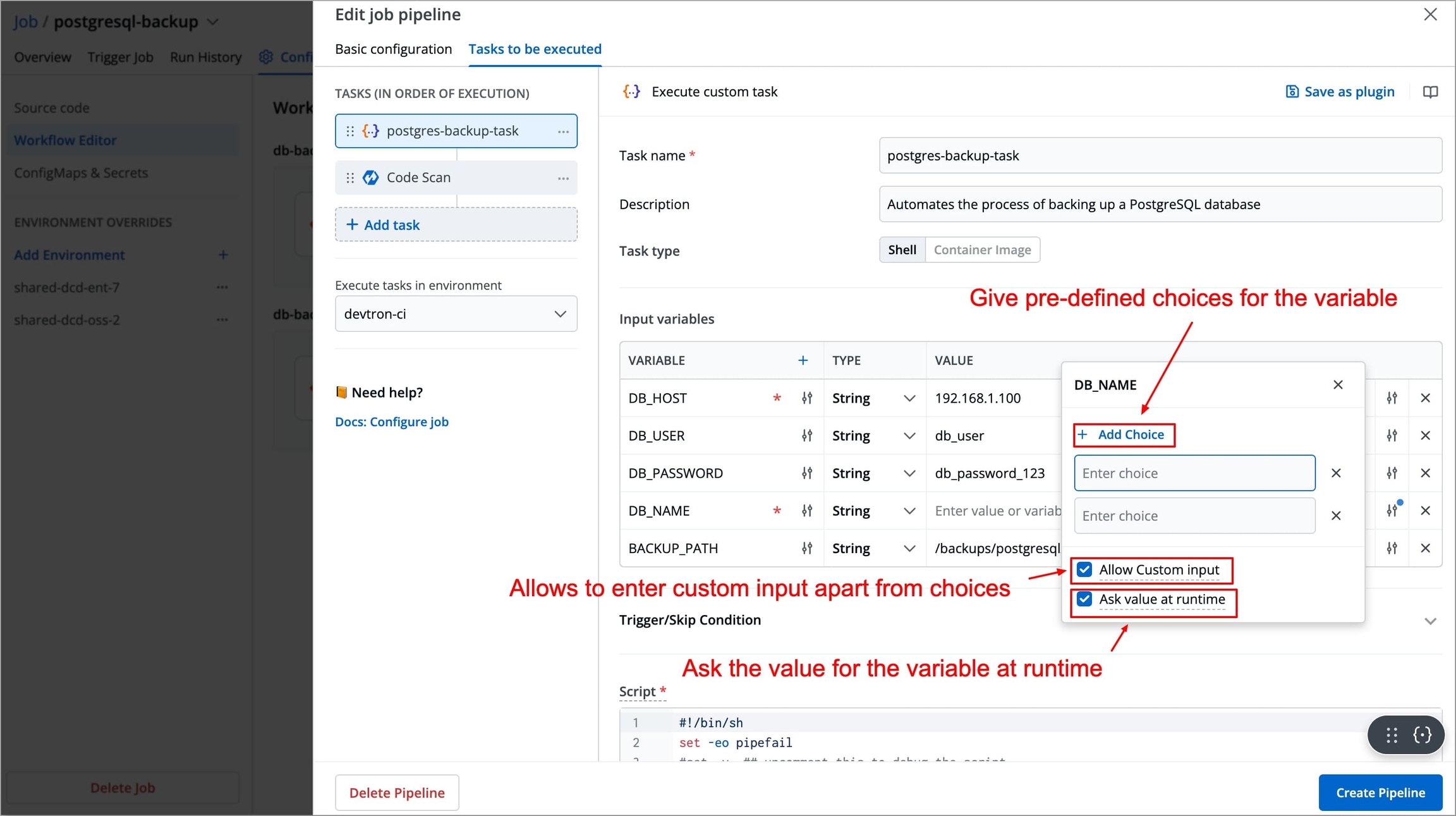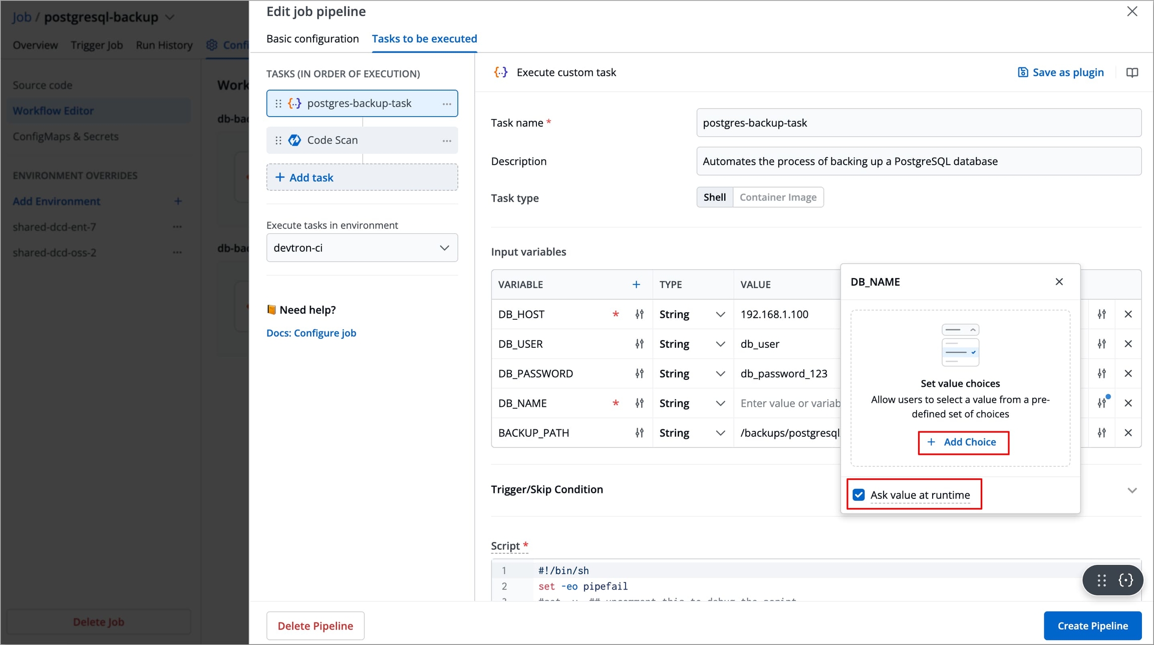 ShellorContainer Image.Shell Tasks: These execute shell scripts directly within the job runtime environment. In this type of task, you can define inline scripts or use script files from your configured source code.