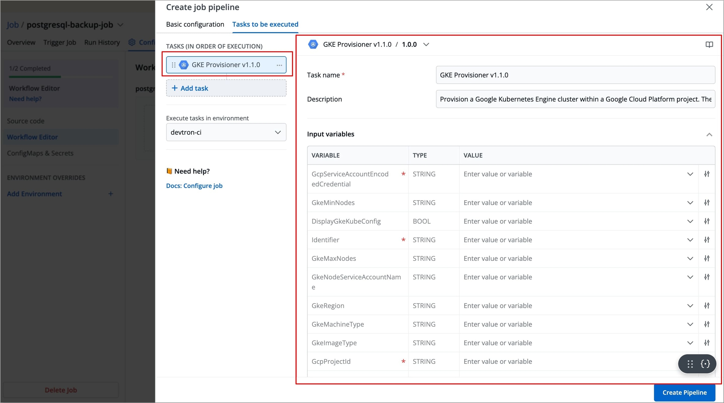 To create a task using the GKE Provisioner plugin, follow the steps below: