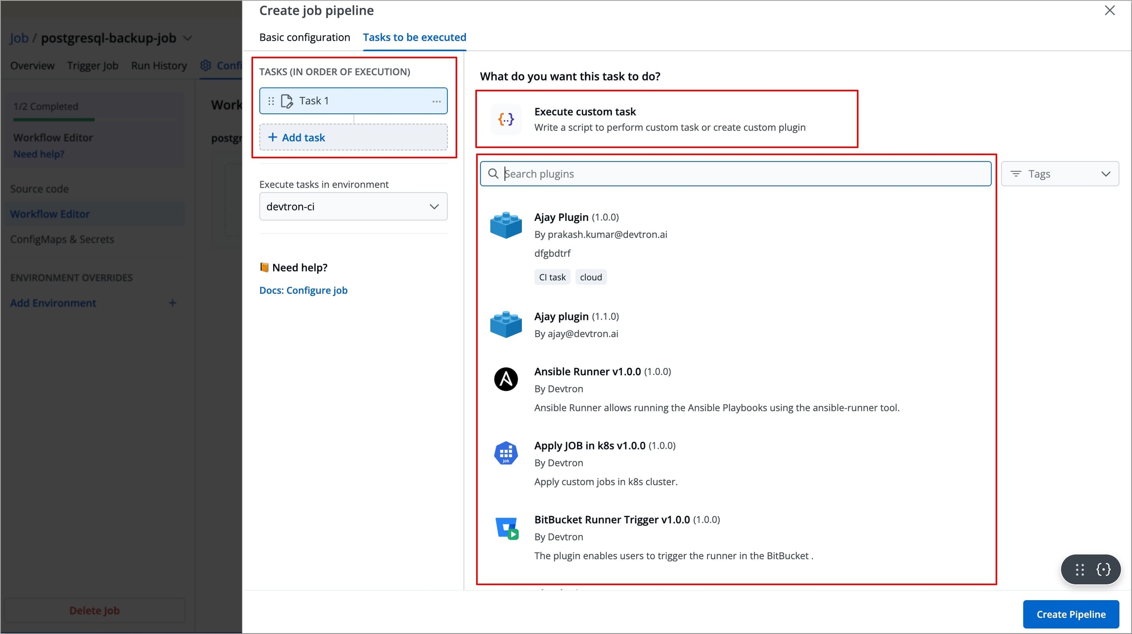 Figure 7: Adding Task A new task will be added (on the left side of the 'Create job pipeline' window). You can configure the task either by selecting one of the available preset plugins or by Executing a custom script