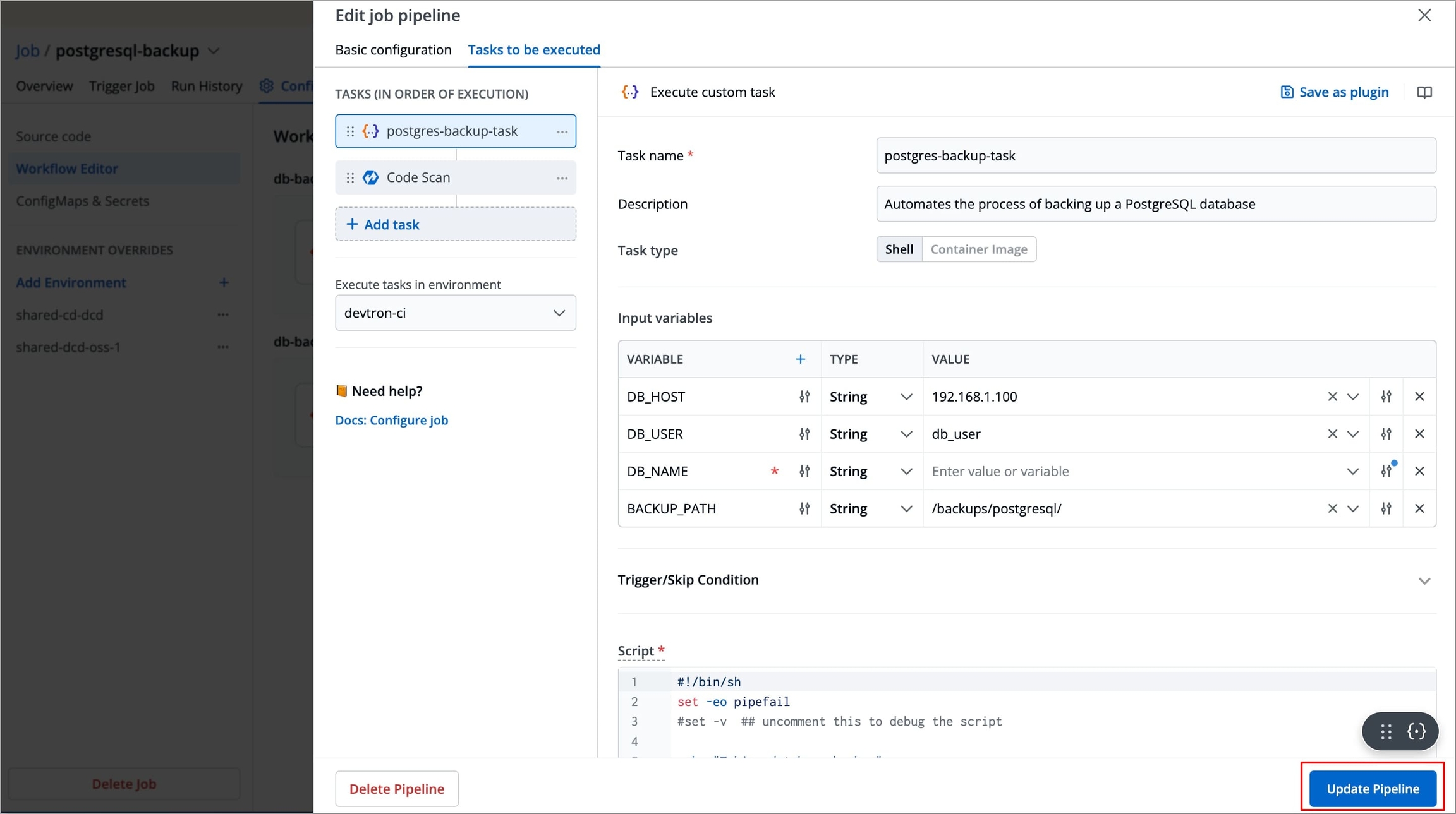 Let's take an example of a Shell task for a job that allows you to back up a specific PostgreSQL database and store it as a file.