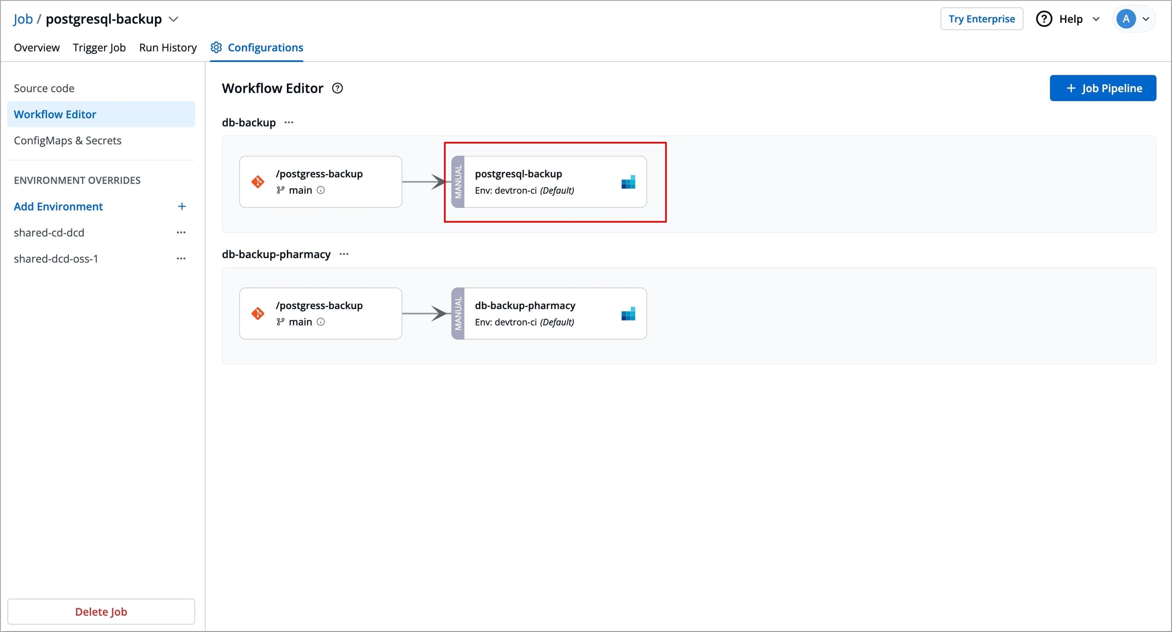 The Workflow Editor in Devtron allows you to create and manage job pipelines. It provides a visual interface to create and configure job pipelines, define basic configurations such as trigger types, branch name, and allows you to add Tasks to be executed in the desired sequence.