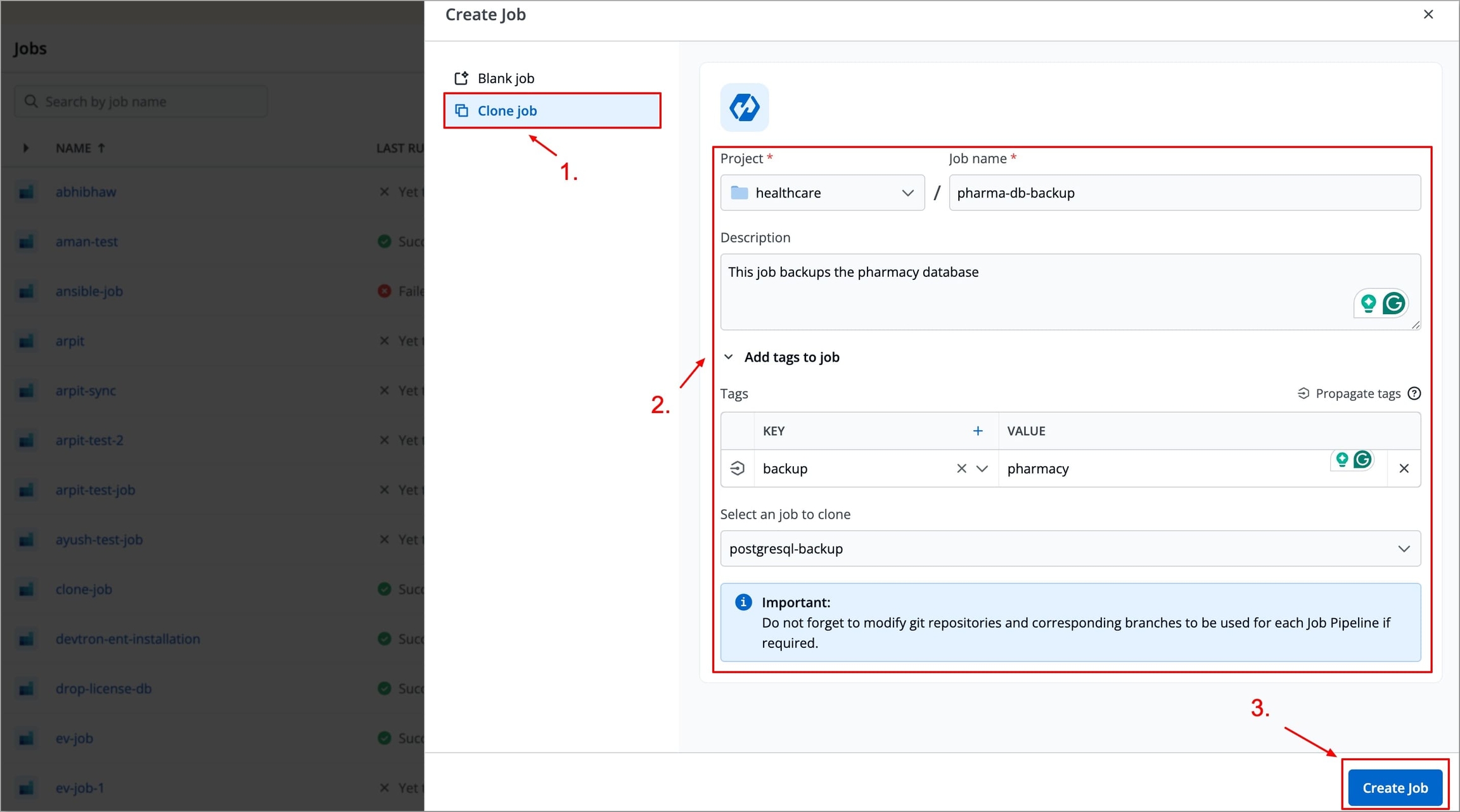 Figure 4: Selecting Job The Create Job page opens. From the left panel, select Clone Job, then enter the required details as listed in the table below.